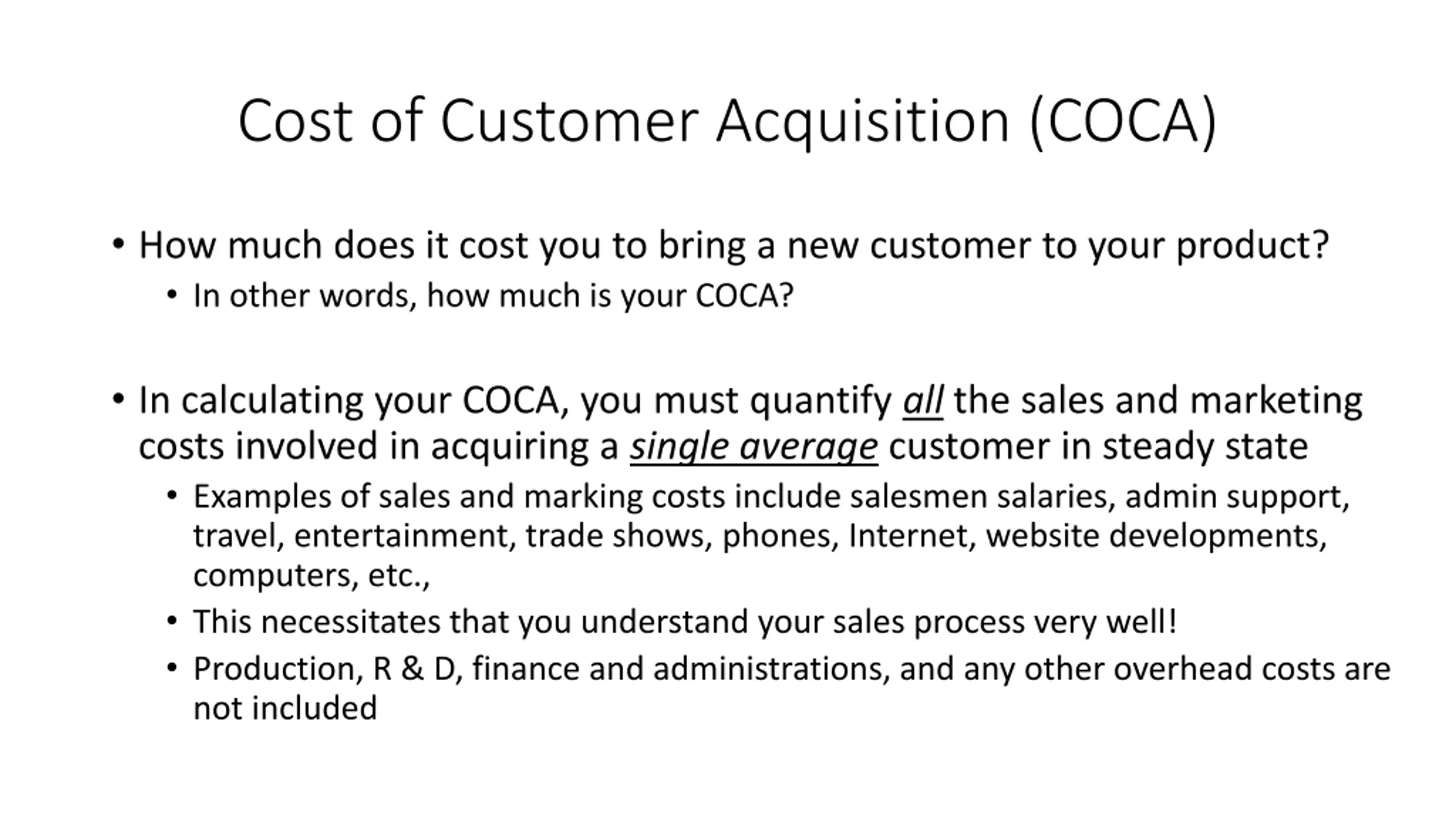 Cost of Customer Acquisition (COCA) How much does it cost you to bring a new customer to your product? In other words, how much is your COCA? In calculating your COCA, you must quantify all the sales and marketing costs involved in acquiring a single average customer in steady state Examples of sales and marking costs include salesmen salaries, admin support, travel, entertainment, trade shows, phones, Internet, website developments, computers, etc., This necessitates that you understand your sales process very well! Production, R & D, finance and administrations, and any other overhead costs are not included