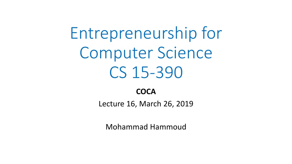 Entrepreneurship for Computer Science CS 15-390 COCA Lecture 16, March 26, 2019 Mohammad Hammoud