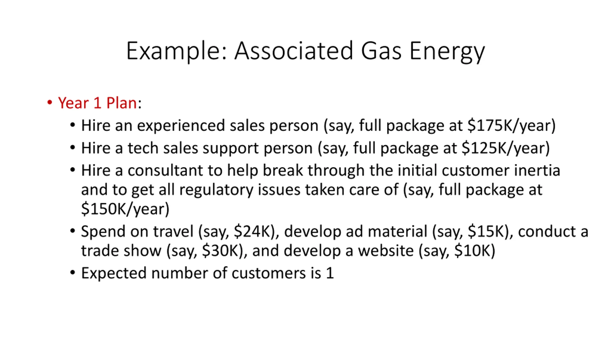 Example: Associated Gas Energy Year 1 Plan: Hire an experienced sales person (say, full package at $175K/year) Hire a tech sales support person (say, full package at $125K/year) Hire a consultant to help break through the initial customer inertia and to get all regulatory issues taken care of (say, full package at $150K/year) Spend on travel (say, $24K), develop ad material (say, $15K), conduct a trade show (say, $30K), and develop a website (say, $10K) Expected number of customers is 1