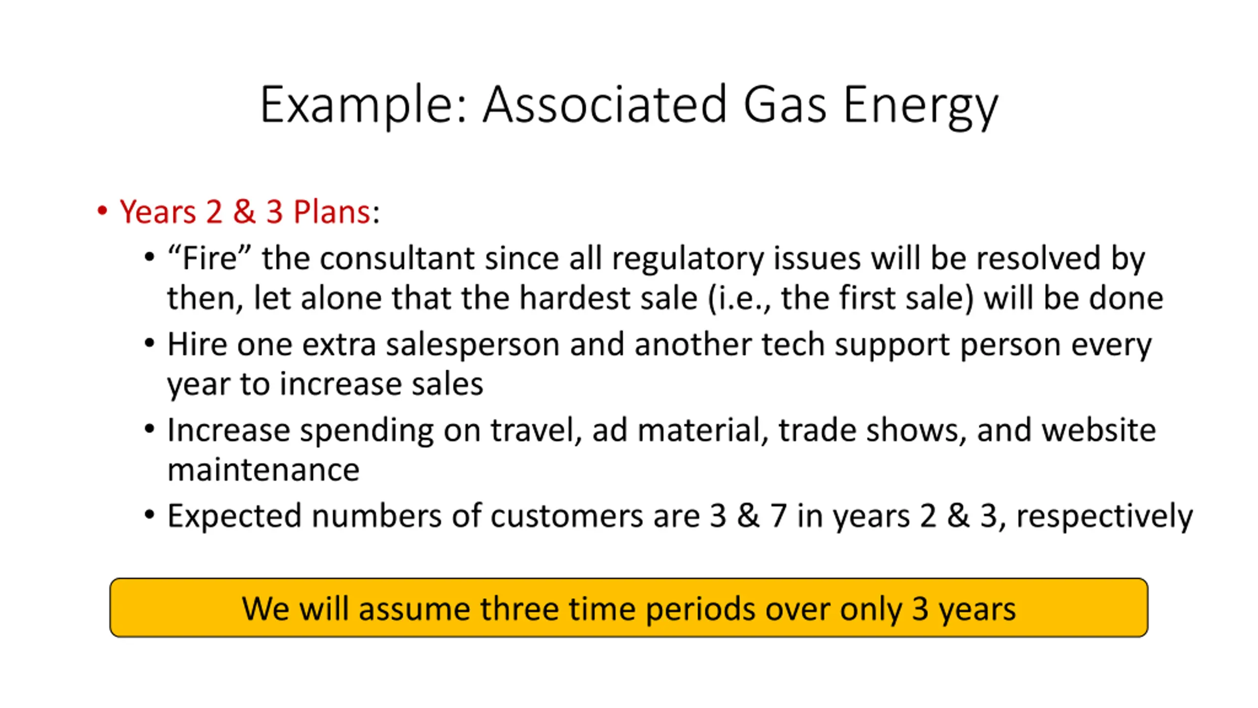 Example: Associated Gas Energy Years 2 & 3 Plans: Fire the consultant since all regulatory issues will be resolved by then, let alone that the hardest sale (i.e., the first sale) will be done Hire one extra salesperson and another tech support person every year to increase sales Increase spending on travel, ad material, trade shows, and website maintenance Expected numbers of customers are 3 & 7 in years 2 & 3, respectively We will assume three time periods over only 3 years