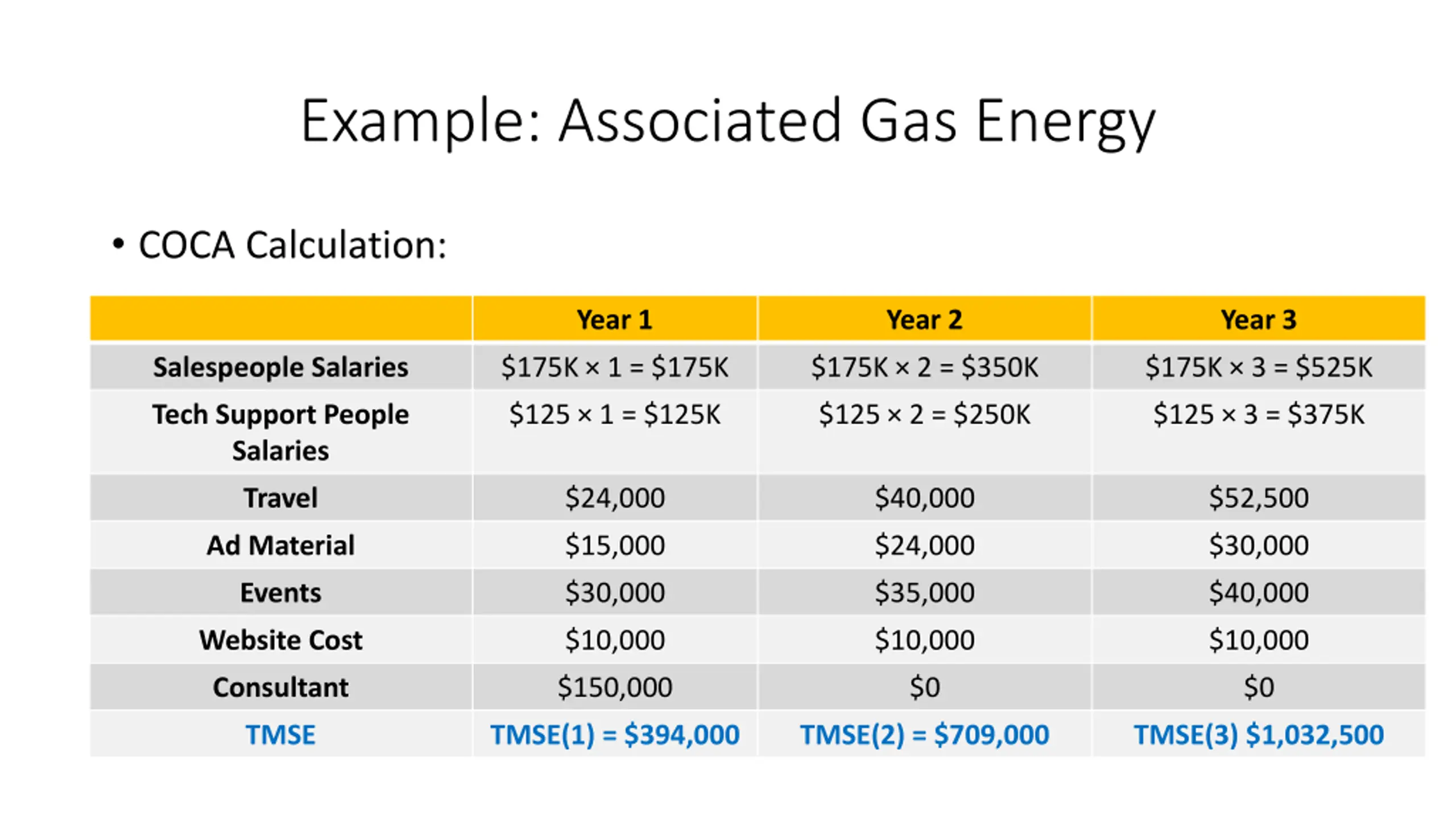 Example: Associated Gas Energy COCA Calculation: Year 1 Year 1 Year 1 Year 1 Year 1 Year 1 Year 1 Year 1 Year 2 Year 2 Year 2 Year 2 Year 2 Year 2 Year 2 Year 2 Year 3 Year 3 Year 3 Year 3 Year 3 Year 3 Year 3 Year 3 Salespeople Salaries Salespeople Salaries Salespeople Salaries Salespeople Salaries Salespeople Salaries Salespeople Salaries Salespeople Salaries Salespeople Salaries $175K 1 = $175K $175K 1 = $175K $175K 1 = $175K $175K 1 = $175K $175K 1 = $175K $175K 1 = $175K $175K 1 = $175K $175K 1 = $175K $175K 2 = $350K $175K 2 = $350K $175K 2 = $350K $175K 2 = $350K $175K 2 = $350K $175K 2 = $350K $175K 2 = $350K $175K 2 = $350K $175K 3 = $525K $175K 3 = $525K $175K 3 = $525K $175K 3 = $525K $175K 3 = $525K $175K 3 = $525K $175K 3 = $525K $175K 3 = $525K Tech Support People Tech Support People Tech Support People Tech Support People Tech Support People Tech Support People Tech Support People Tech Support People Salaries Salaries Salaries Salaries Salaries Salaries Salaries Salaries $125 1 = $125K $125 1 = $125K $125 1 = $125K $125 1 = $125K $125 1 = $125K $125 1 = $125K $125 1 = $125K $125 1 = $125K $125 2 = $250K $125 2 = $250K $125 2 = $250K $125 2 = $250K $125 2 = $250K $125 2 = $250K $125 2 = $250K $125 2 = $250K $125 3 = $375K $125 3 = $375K $125 3 = $375K $125 3 = $375K $125 3 = $375K $125 3 = $375K $125 3 = $375K $125 3 = $375K Travel Travel Travel Travel Travel Travel Travel Travel $24,000 $24,000 $24,000 $24,000 $24,000 $24,000 $24,000 $24,000 $40,000 $40,000 $40,000 $40,000 $40,000 $40,000 $40,000 $40,000 $52,500 $52,500 $52,500 $52,500 $52,500 $52,500 $52,500 $52,500 Ad Material Ad Material Ad Material Ad Material Ad Material Ad Material Ad Material Ad Material $15,000 $15,000 $15,000 $15,000 $15,000 $15,000 $15,000 $15,000 $24,000 $24,000 $24,000 $24,000 $24,000 $24,000 $24,000 $24,000 $30,000 $30,000 $30,000 $30,000 $30,000 $30,000 $30,000 $30,000 Events Events Events Events Events Events Events Events $30,000 $30,000 $30,000 $30,000 $30,000 $30,000 $30,000 $30,000 $35,000 $35,000 $35,000 $35,000 $35,000 $35,000 $35,000 $35,000 $40,000 $40,000 $40,000 $40,000 $40,000 $40,000 $40,000 $40,000 Website Cost Website Cost Website Cost Website Cost Website Cost Website Cost Website Cost Website Cost $10,000 $10,000 $10,000 $10,000 $10,000 $10,000 $10,000 $10,000 $10,000 $10,000 $10,000 $10,000 $10,000 $10,000 $10,000 $10,000 $10,000 $10,000 $10,000 $10,000 $10,000 $10,000 $10,000 $10,000 Consultant Consultant Consultant Consultant Consultant Consultant Consultant Consultant $150,000 $150,000 $150,000 $150,000 $150,000 $150,000 $150,000 $150,000 $0 $0 $0 $0 $0 $0 $0 $0 $0 $0 $0 $0 $0 $0 $0 $0 TMSE TMSE TMSE TMSE TMSE TMSE TMSE TMSE TMSE(1) = $394,000 TMSE(1) = $394,000 TMSE(1) = $394,000 TMSE(1) = $394,000 TMSE(1) = $394,000 TMSE(1) = $394,000 TMSE(1) = $394,000 TMSE(1) = $394,000 TMSE(2) = $709,000 TMSE(2) = $709,000 TMSE(2) = $709,000 TMSE(2) = $709,000 TMSE(2) = $709,000 TMSE(2) = $709,000 TMSE(2) = $709,000 TMSE(2) = $709,000 TMSE(3) $1,032,500 TMSE(3) $1,032,500 TMSE(3) $1,032,500 TMSE(3) $1,032,500 TMSE(3) $1,032,500 TMSE(3) $1,032,500 TMSE(3) $1,032,500 TMSE(3) $1,032,500