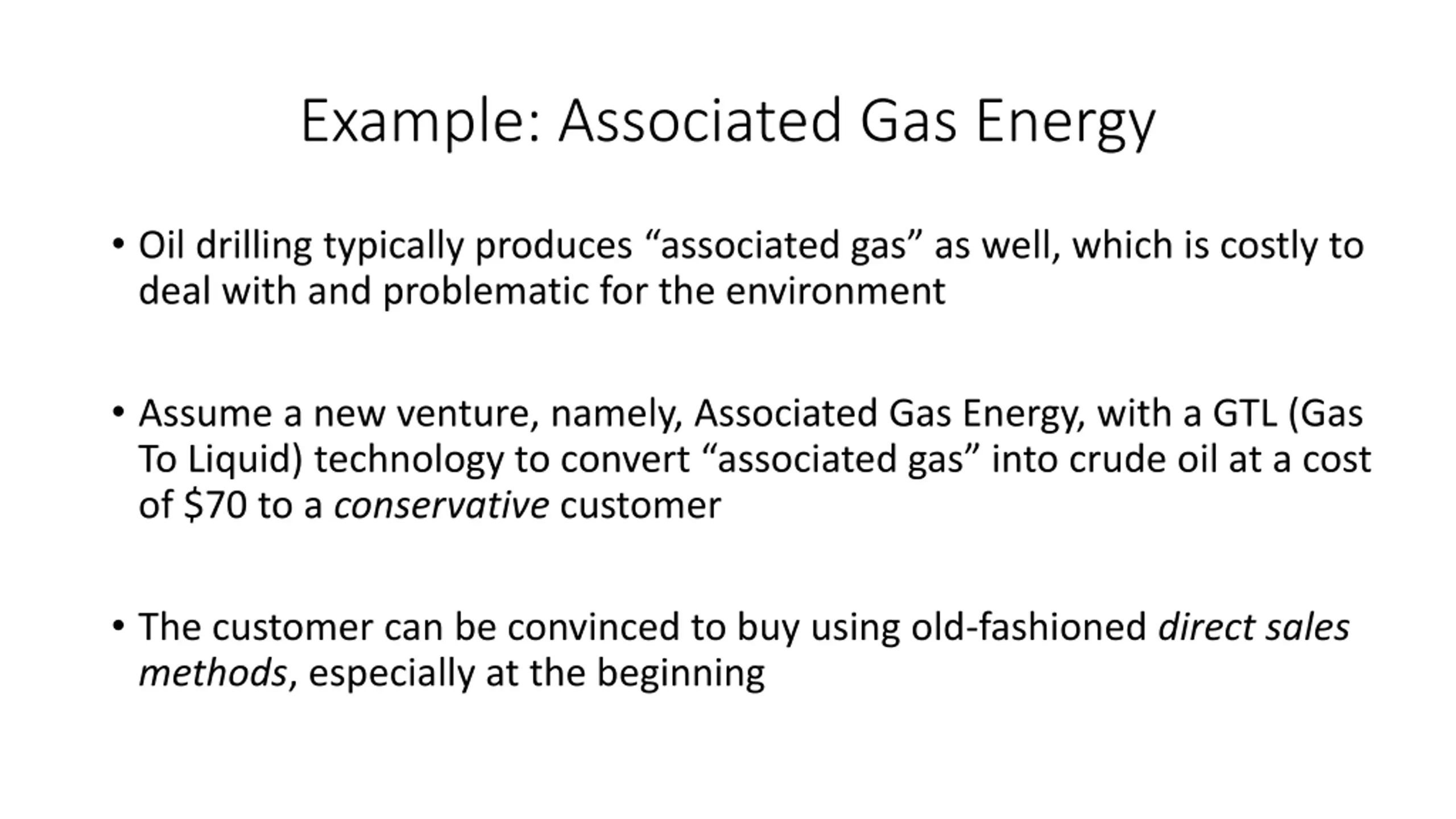 Example: Associated Gas Energy Oil drilling typically produces associated gas as well, which is costly to deal with and problematic for the environment Assume a new venture, namely, Associated Gas Energy, with a GTL (Gas To Liquid) technology to convert associated gas into crude oil at a cost of $70 to a conservative customer The customer can be convinced to buy using old-fashioned direct sales methods, especially at the beginning