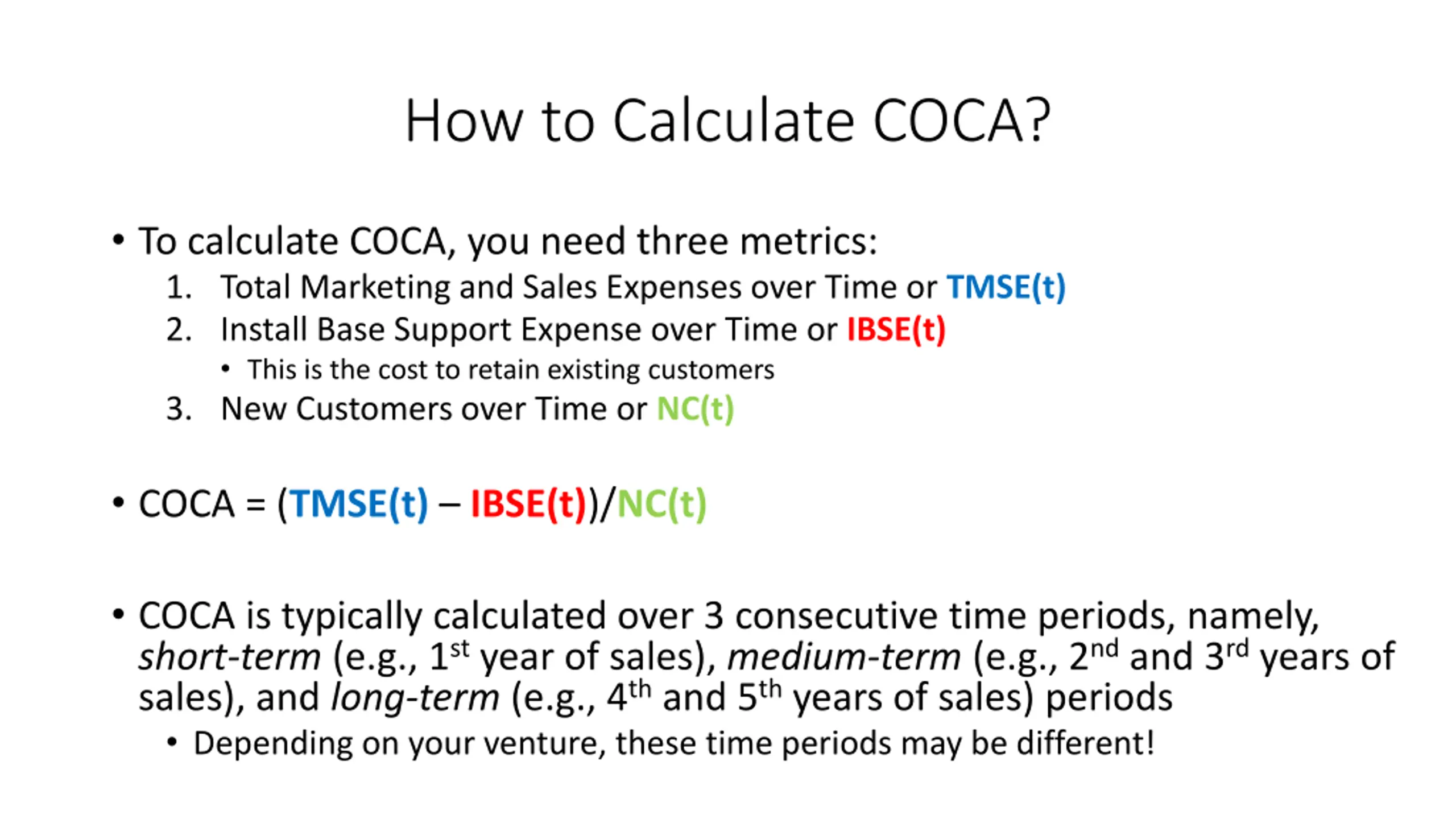How to Calculate COCA? To calculate COCA, you need three metrics: 1. Total Marketing and Sales Expenses over Time or TMSE(t) 2. Install Base Support Expense over Time or IBSE(t) This is the cost to retain existing customers 3. New Customers over Time or NC(t) COCA = (TMSE(t) IBSE(t))/NC(t) COCA is typically calculated over 3 consecutive time periods, namely, short-term (e.g., 1st year of sales), medium-term (e.g., 2nd and 3rd years of sales), and long-term (e.g., 4th and 5th years of sales) periods Depending on your venture, these time periods may be different!
