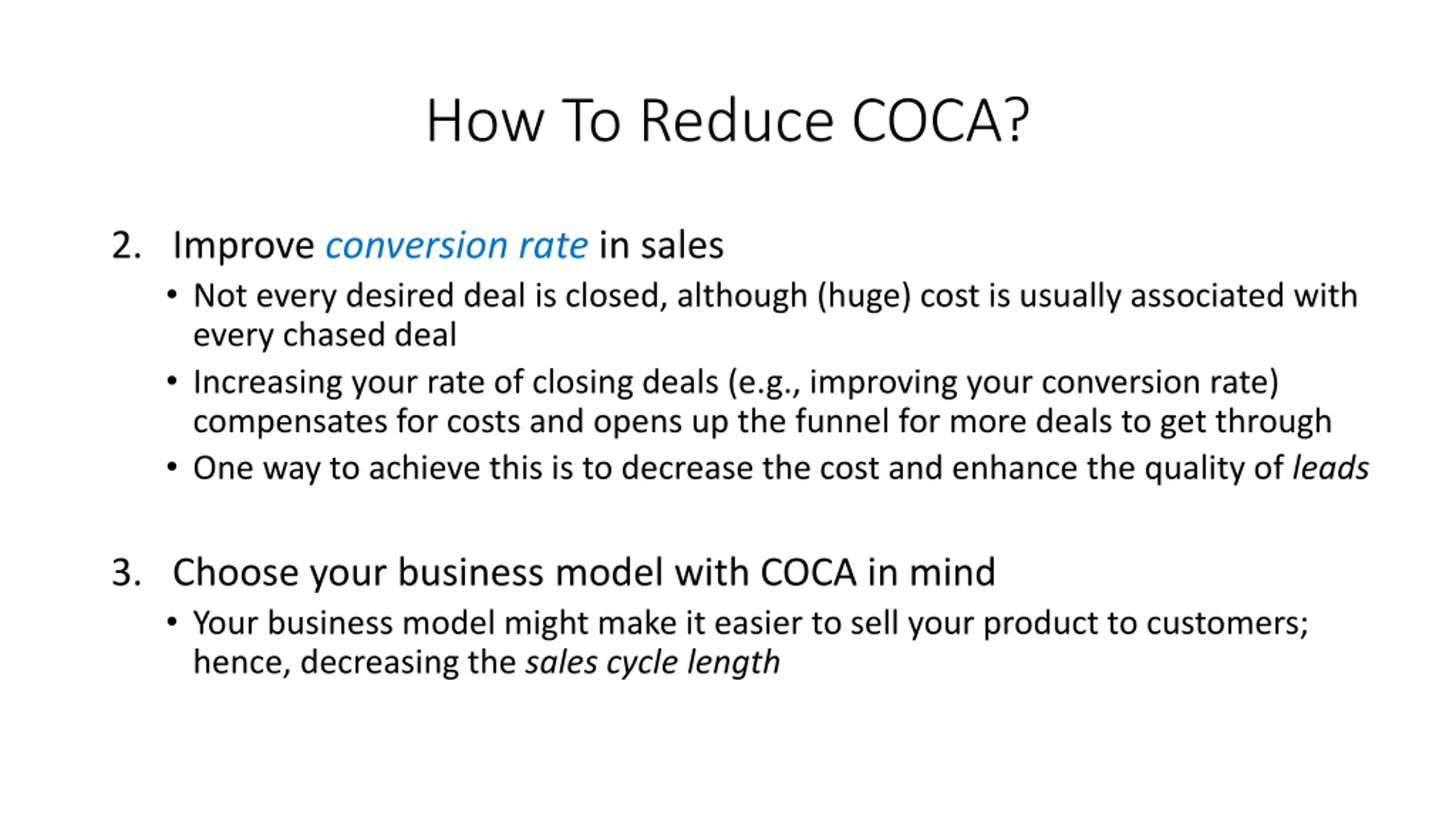 How To Reduce COCA? 2. Improve conversion rate in sales Not every desired deal is closed, although (huge) cost is usually associated with every chased deal Increasing your rate of closing deals (e.g., improving your conversion rate) compensates for costs and opens up the funnel for more deals to get through One way to achieve this is to decrease the cost and enhance the quality of leads 3. Choose your business model with COCA in mind Your business model might make it easier to sell your product to customers; hence, decreasing the sales cycle length