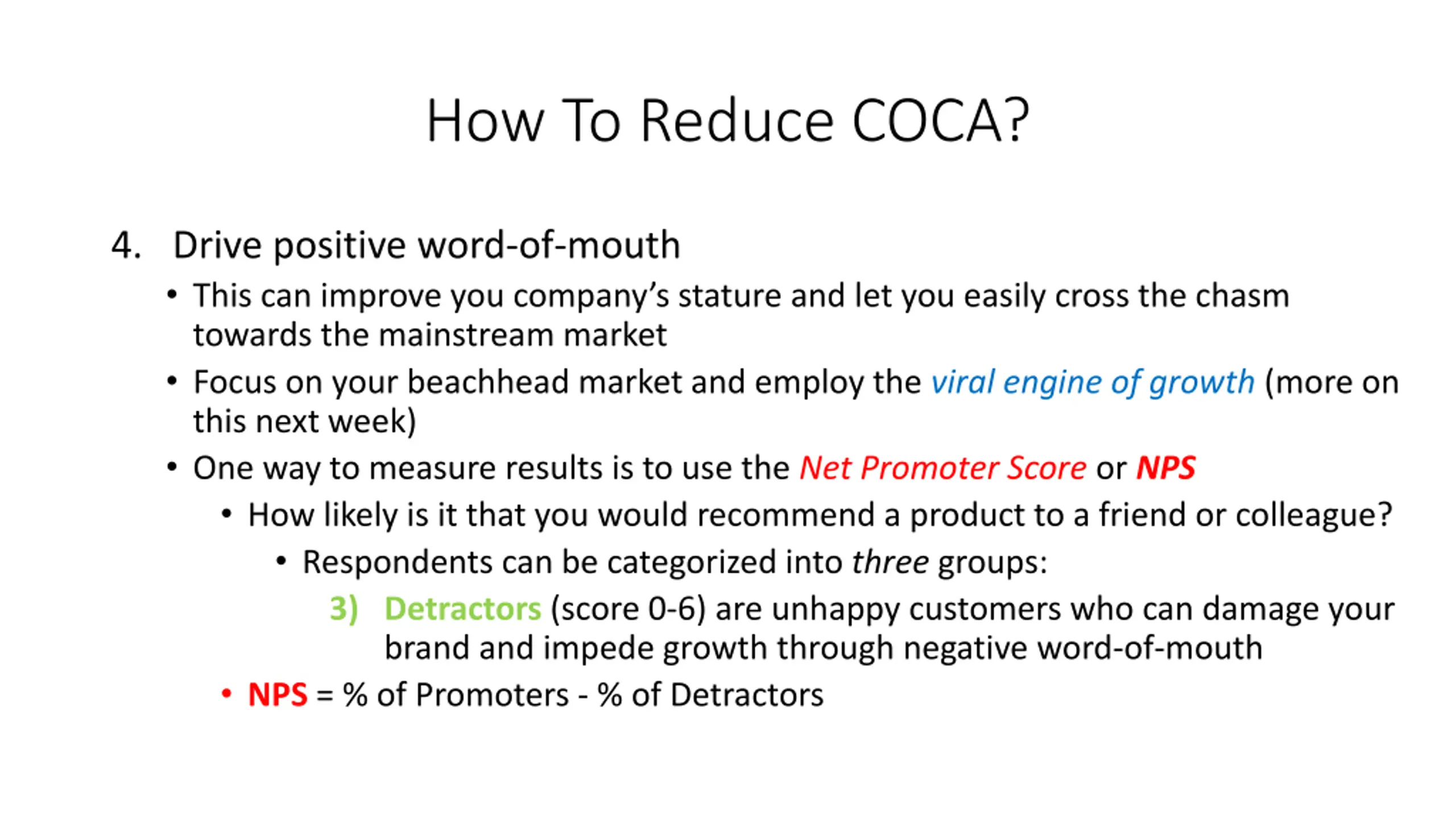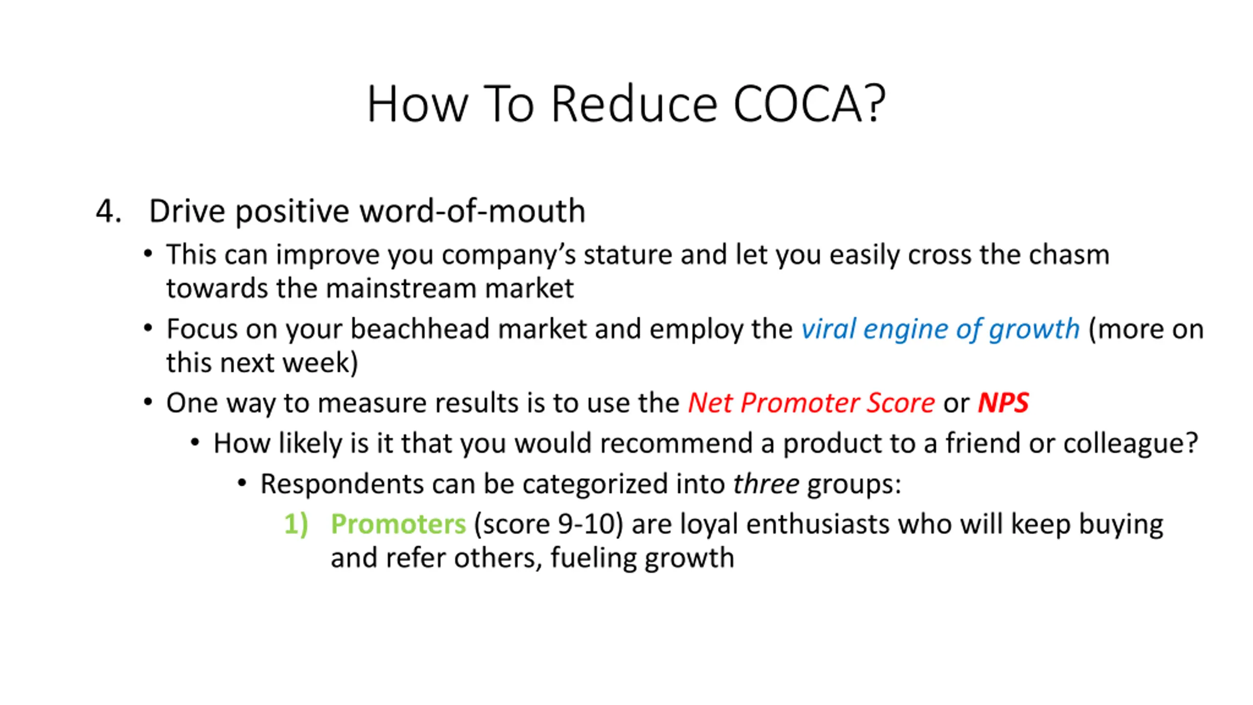 How To Reduce COCA? 4. Drive positive word-of-mouth This can improve you company s stature and let you easily cross the chasm towards the mainstream market Focus on your beachhead market and employ the viral engine of growth (more on this next week) One way to measure results is to use the Net Promoter Score or NPS How likely is it that you would recommend a product to a friend or colleague? Respondents can be categorized into three groups: 1) Promoters (score 9-10) are loyal enthusiasts who will keep buying and refer others, fueling growth