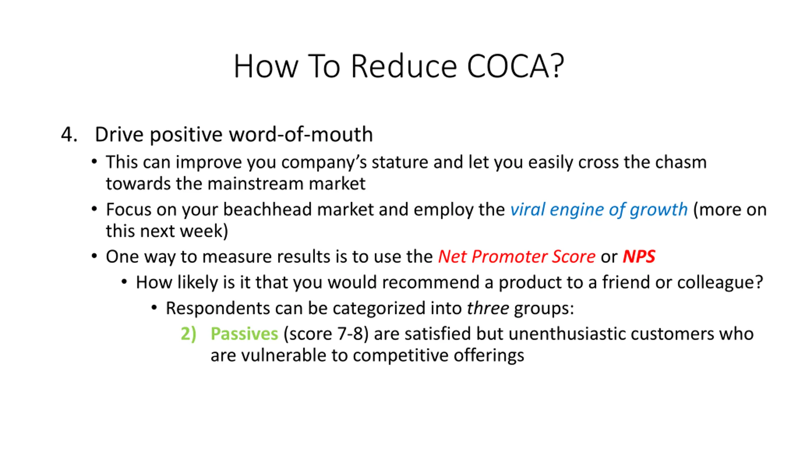 How To Reduce COCA? 4. Drive positive word-of-mouth This can improve you company s stature and let you easily cross the chasm towards the mainstream market Focus on your beachhead market and employ the viral engine of growth (more on this next week) One way to measure results is to use the Net Promoter Score or NPS How likely is it that you would recommend a product to a friend or colleague? Respondents can be categorized into three groups: 2) Passives (score 7-8) are satisfied but unenthusiastic customers who are vulnerable to competitive offerings