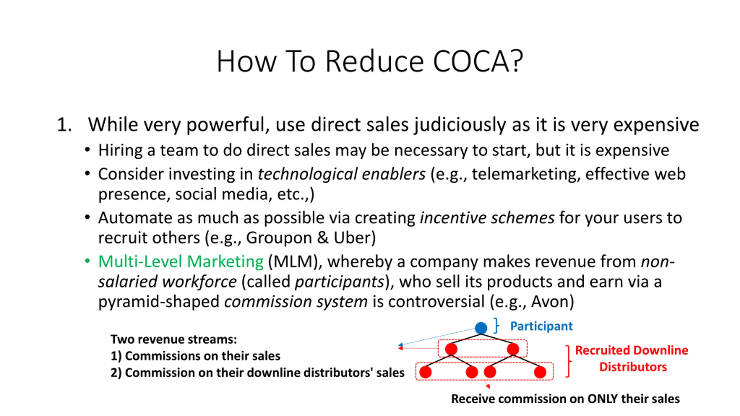 How To Reduce COCA? 1. While very powerful, use direct sales judiciously as it is very expensive Hiring a team to do direct sales may be necessary to start, but it is expensive Consider investing in technological enablers (e.g., telemarketing, effective web presence, social media, etc.,) Automate as much as possible via creating incentive schemes for your users to recruit others (e.g., Groupon & Uber) Multi-Level Marketing (MLM), whereby a company makes revenue from non- salaried workforce (called participants), who sell its products and earn via a pyramid-shaped commission system is controversial (e.g., Avon) Participant Two revenue streams: 1) Commissions on their sales 2) Commission on their downline distributors' sales Recruited Downline Distributors Receive commission on ONLY their sales