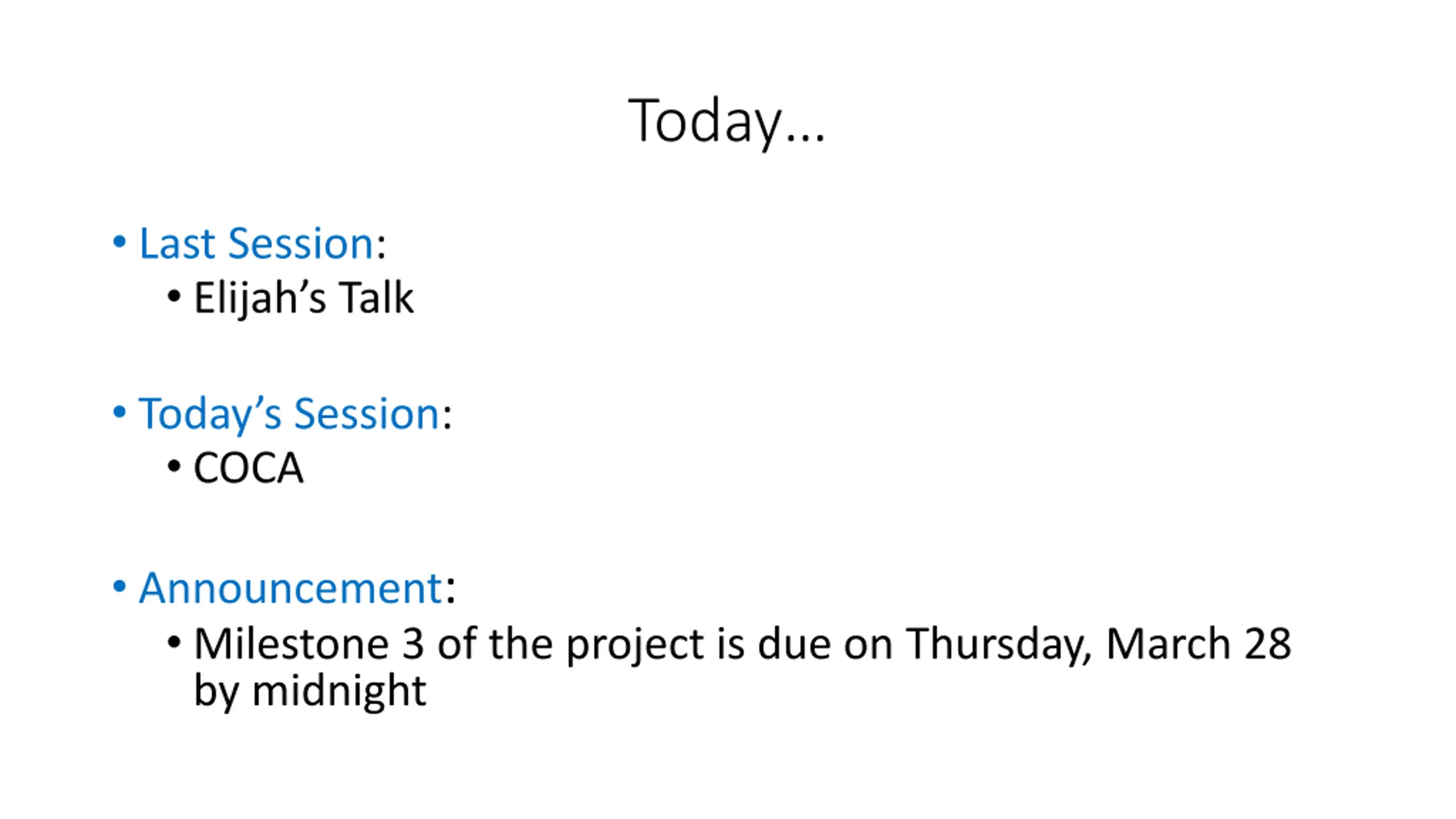 Today Last Session: Elijah s Talk Today s Session: COCA Announcement: Milestone 3 of the project is due on Thursday, March 28 by midnight