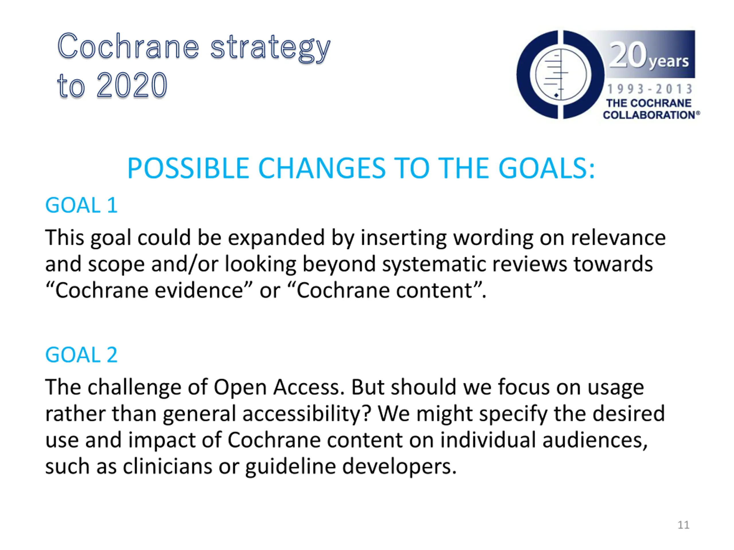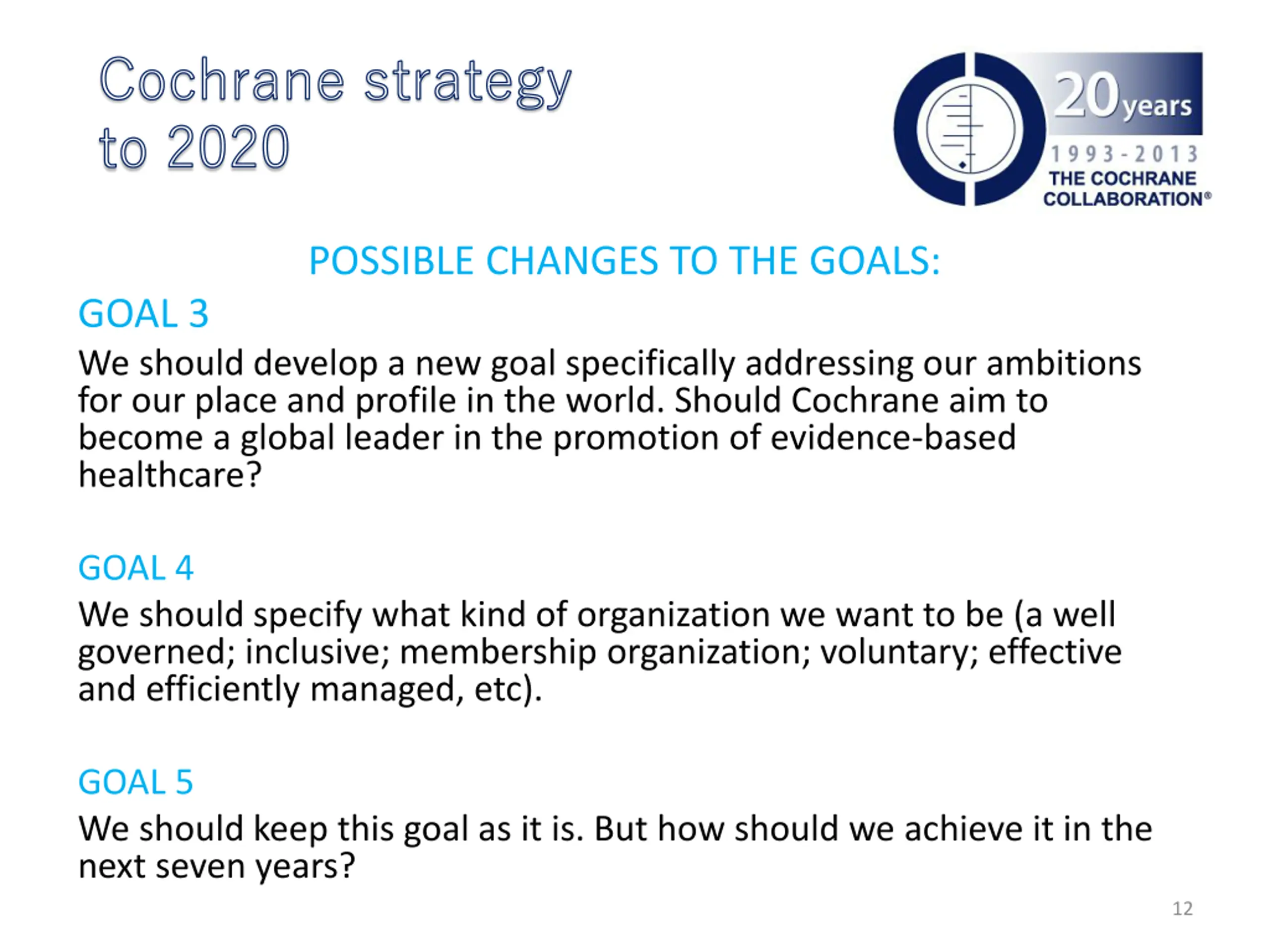 Cochrane strategy to 2020 POSSIBLE CHANGES TO THE GOALS: GOAL 1 This goal could be expanded by inserting wording on relevance and scope and/or looking beyond systematic reviews towards Cochrane evidence or Cochrane content . GOAL 2 The challenge of Open Access. But should we focus on usage rather than general accessibility? We might specify the desired use and impact of Cochrane content on individual audiences, such as clinicians or guideline developers. 11