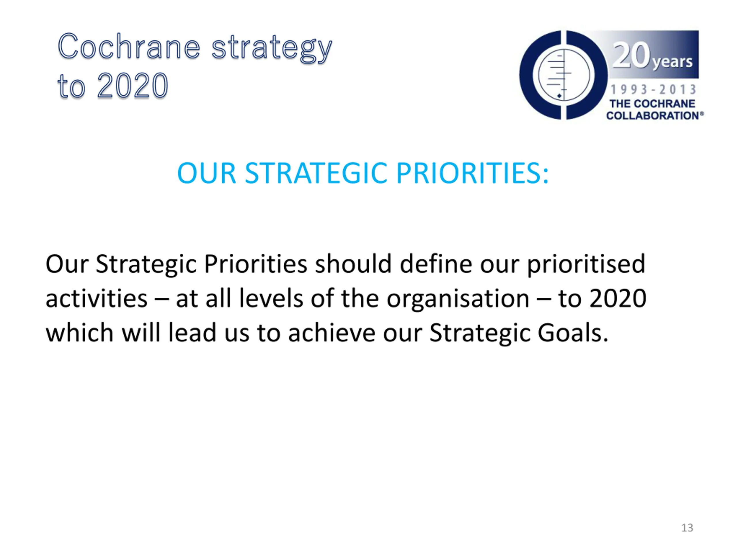 Cochrane strategy to 2020 OUR STRATEGIC PRIORITIES: Our Strategic Priorities should define our prioritised activities at all levels of the organisation to 2020 which will lead us to achieve our Strategic Goals. 13