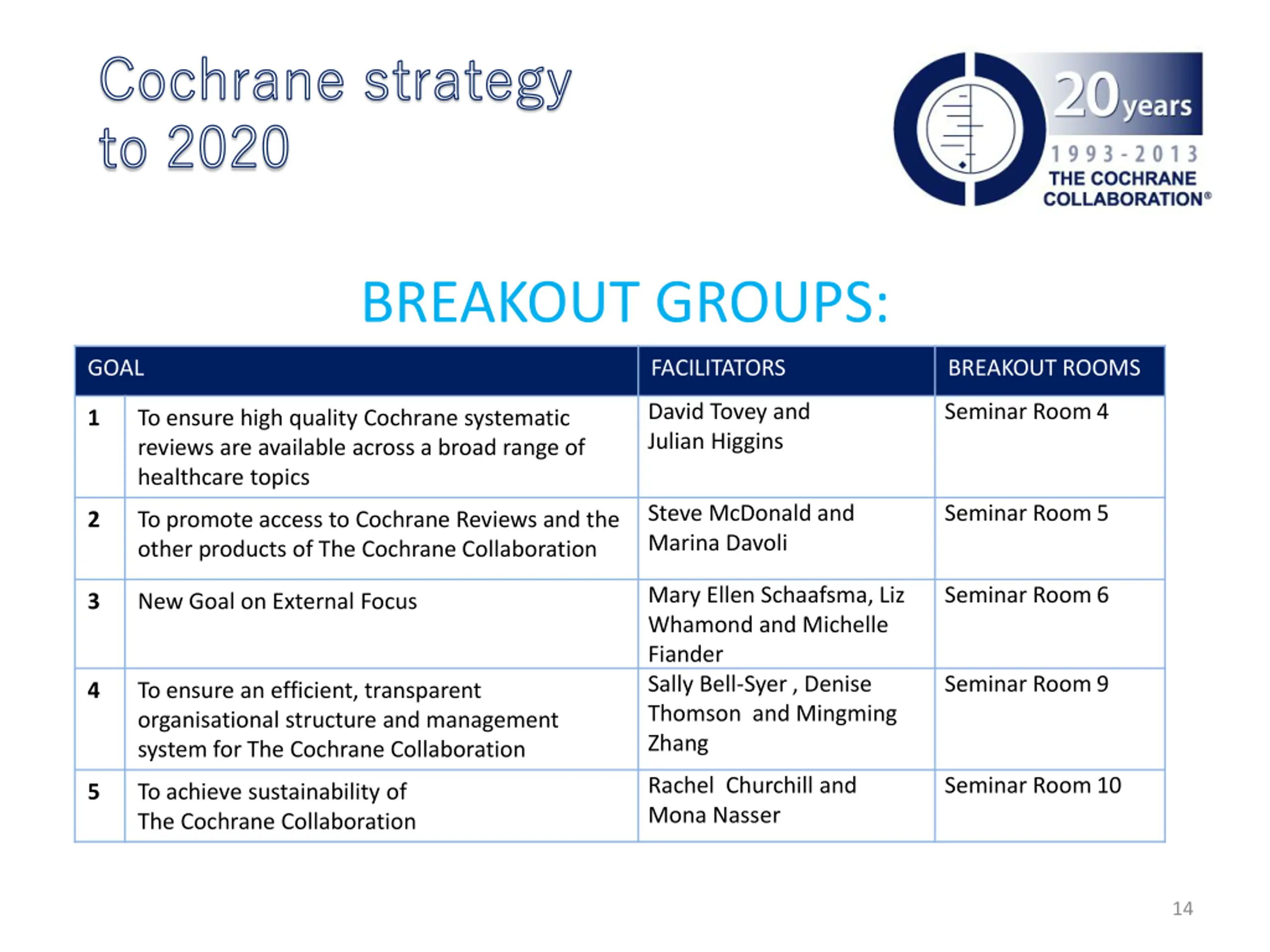 Cochrane strategy to 2020 BREAKOUT GROUPS: GOAL FACILITATORS BREAKOUT ROOMS David Tovey and Julian Higgins Seminar Room 4 1 To ensure high quality Cochrane systematic reviews are available across a broad range of healthcare topics Steve McDonald and Marina Davoli Seminar Room 5 2 To promote access to Cochrane Reviews and the other products of The Cochrane Collaboration Mary Ellen Schaafsma, Liz Whamond and Michelle Fiander Sally Bell-Syer , Denise Thomson and Mingming Zhang Seminar Room 6 3 New Goal on External Focus Seminar Room 9 4 To ensure an efficient, transparent organisational structure and management system for The Cochrane Collaboration Rachel Churchill and Mona Nasser Seminar Room 10 5 To achieve sustainability of The Cochrane Collaboration 14