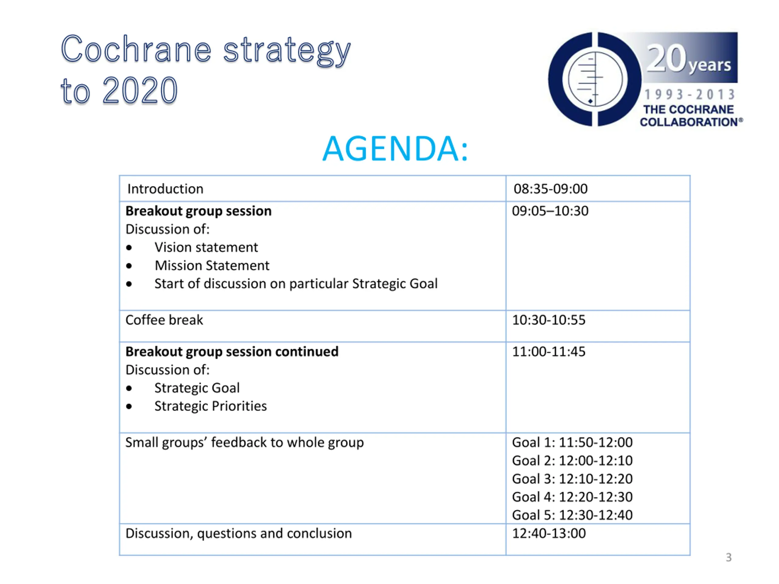 Cochrane strategy to 2020 AGENDA: Introduction Breakout group session Discussion of: Vision statement Mission Statement Start of discussion on particular Strategic Goal 08:35-09:00 09:05 10:30 Coffee break 10:30-10:55 Breakout group session continued Discussion of: Strategic Goal Strategic Priorities 11:00-11:45 Small groups feedback to whole group Goal 1: 11:50-12:00 Goal 2: 12:00-12:10 Goal 3: 12:10-12:20 Goal 4: 12:20-12:30 Goal 5: 12:30-12:40 12:40-13:00 Discussion, questions and conclusion 3