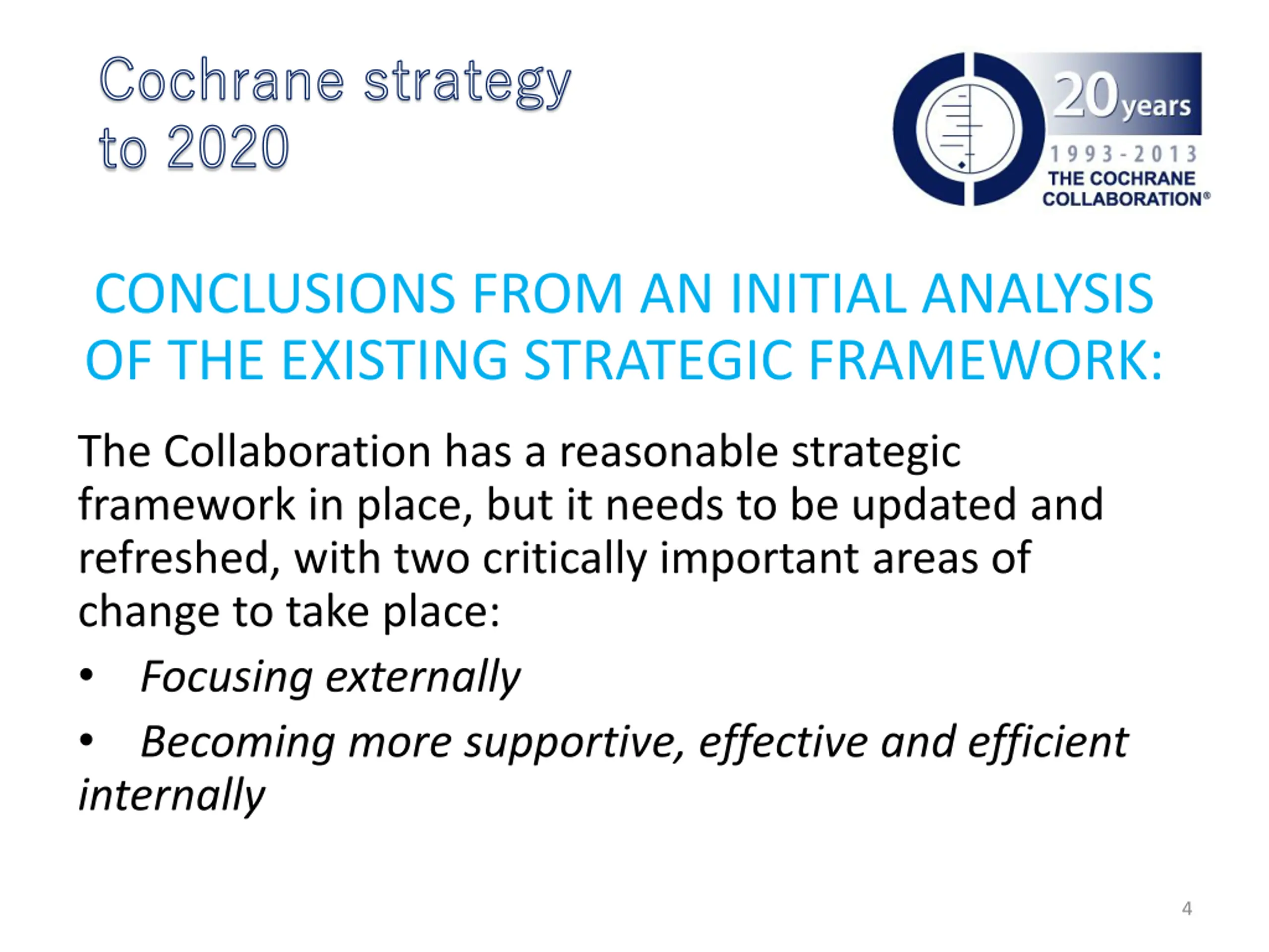 Cochrane strategy to 2020 CONCLUSIONS FROM AN INITIAL ANALYSIS OF THE EXISTING STRATEGIC FRAMEWORK: The Collaboration has a reasonable strategic framework in place, but it needs to be updated and refreshed, with two critically important areas of change to take place: Focusing externally Becoming more supportive, effective and efficient internally 4