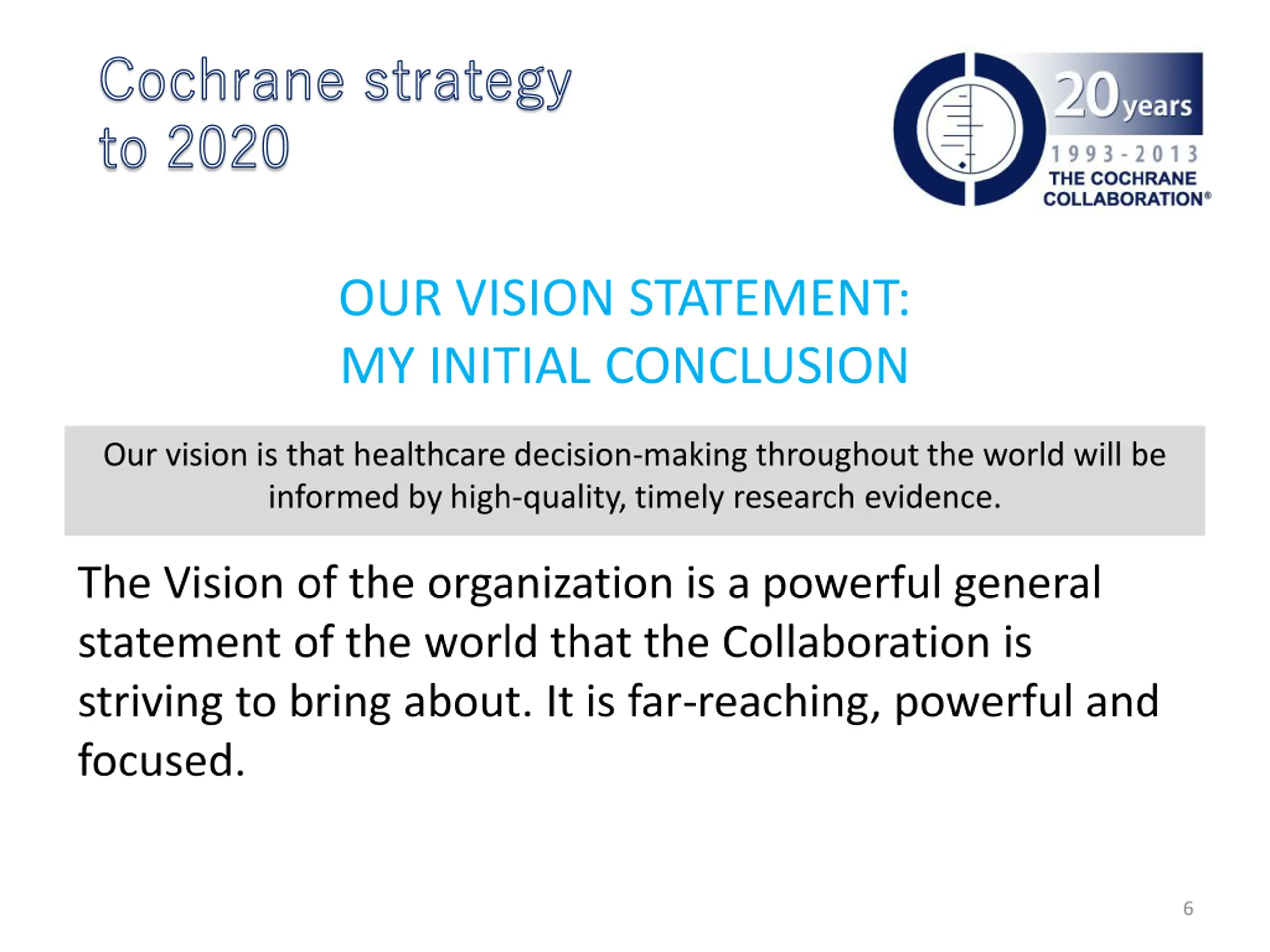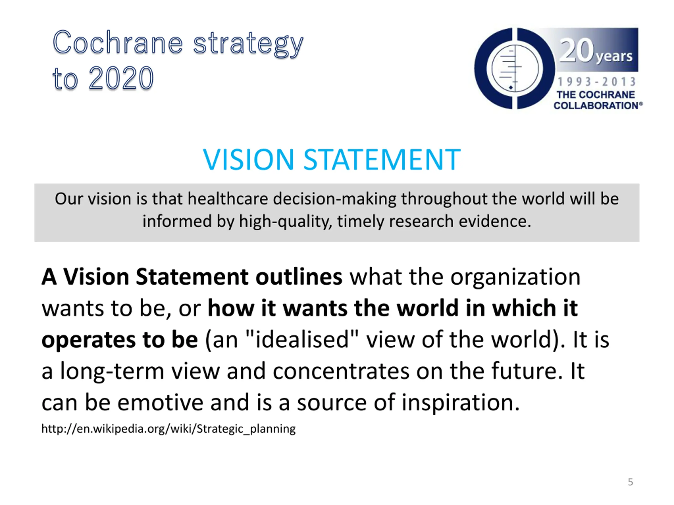 Cochrane strategy to 2020 VISION STATEMENT Our vision is that healthcare decision-making throughout the world will be informed by high-quality, timely research evidence. A Vision Statement outlines what the organization wants to be, or how it wants the world in which it operates to be (an "idealised" view of the world). It is a long-term view and concentrates on the future. It can be emotive and is a source of inspiration. http://en.wikipedia.org/wiki/Strategic_planning 5