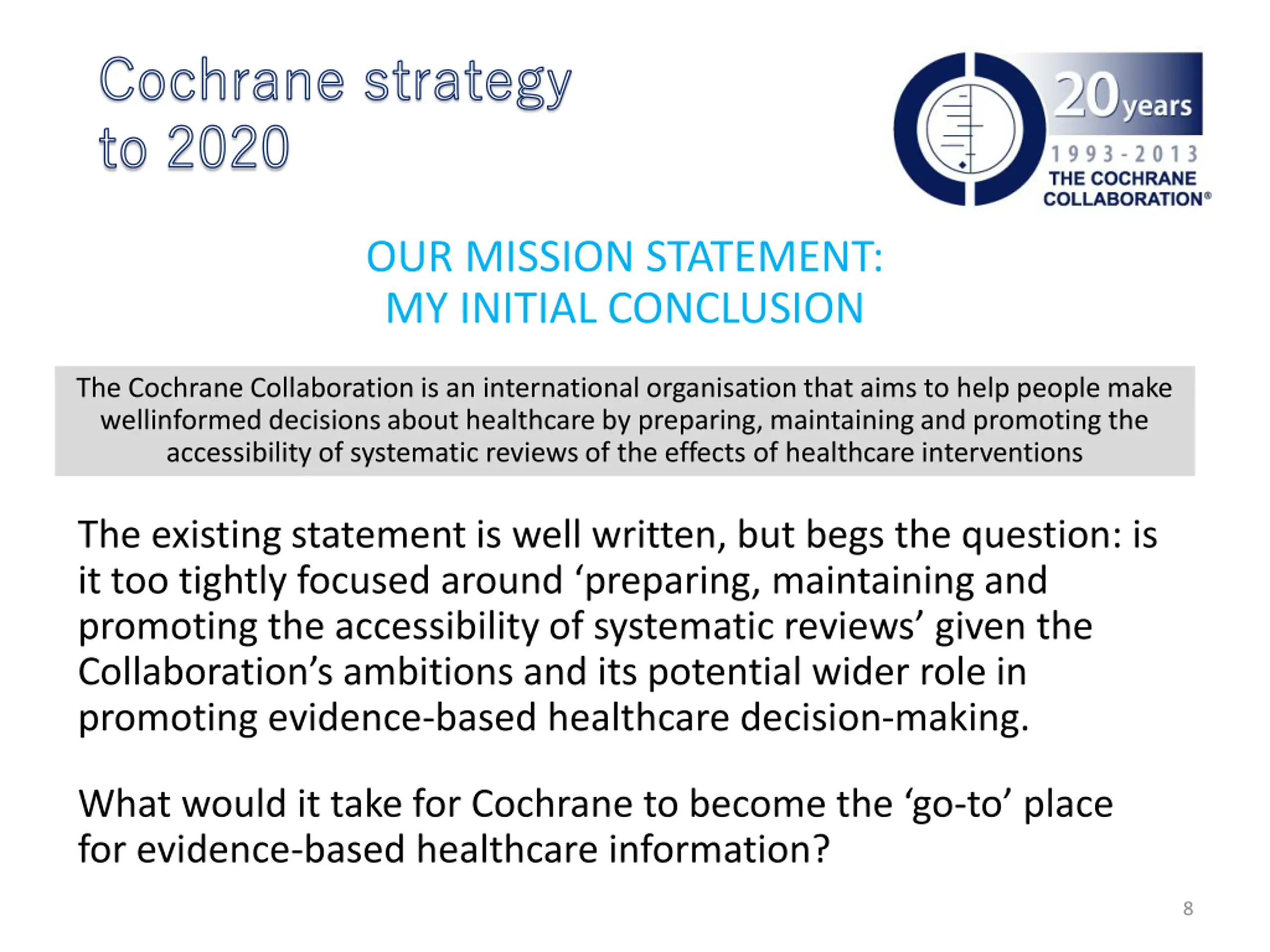 Cochrane strategy to 2020 MISSION STATEMENT The Cochrane Collaboration is an international organisation that aims to help people make wellinformed decisions about healthcare by preparing, maintaining and promoting the accessibility of systematic reviews of the effects of healthcare interventions A Mission Statement defines the fundamental purpose of an organization or an enterprise, succinctly describing why it exists and what it does to achieve its vision. http://en.wikipedia.org/wiki/Strategic_planning 7
