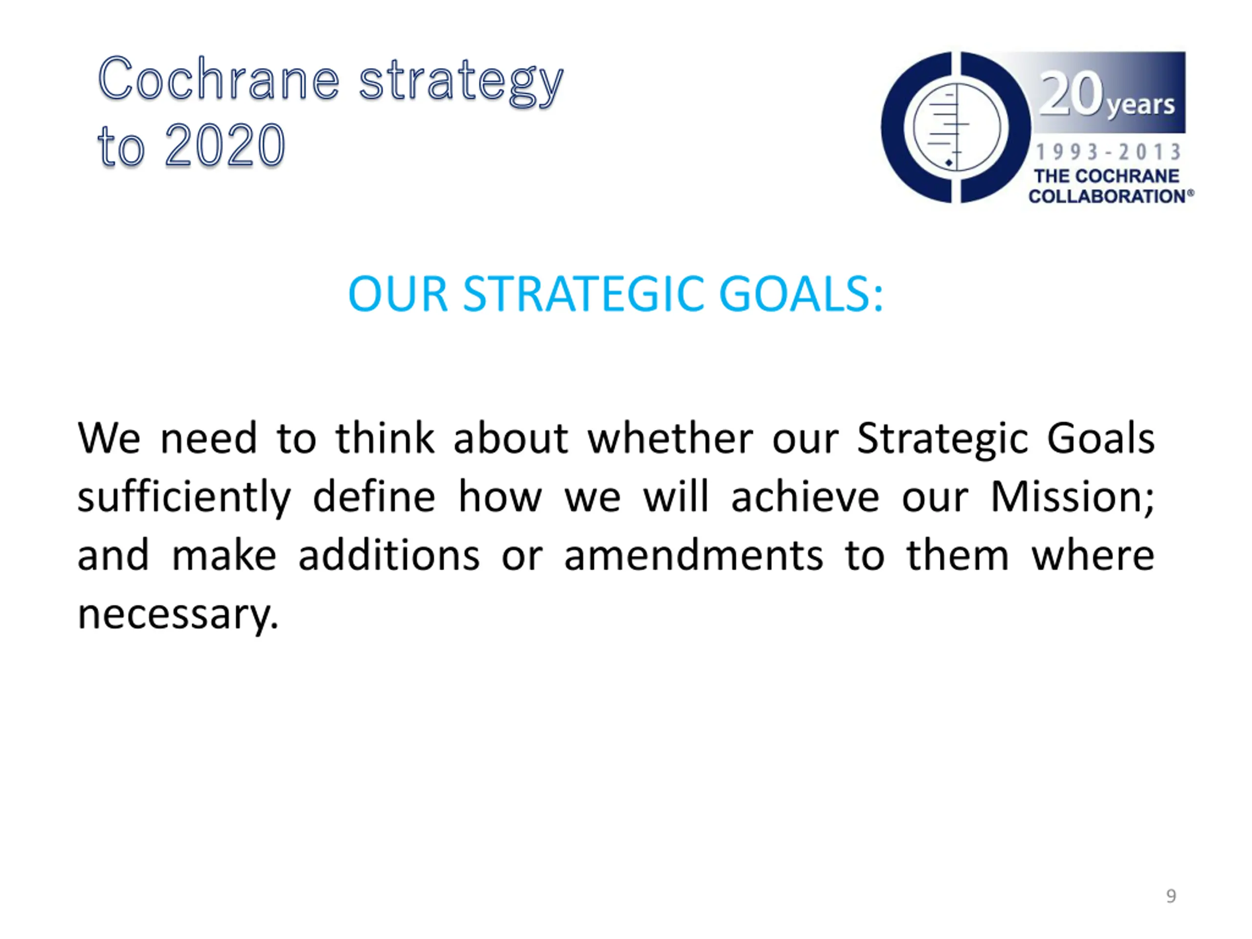 Cochrane strategy to 2020 OUR STRATEGIC GOALS: 1 To ensure high quality Cochrane systematic reviews are available across a broad range of healthcare topics 2 To promote access to Cochrane Reviews and the other products of The Cochrane Collaboration 3 New Goal on External Focus 4 To ensure an efficient, transparent organisational structure and management system for The Cochrane Collaboration 5 To achieve sustainability of The Cochrane Collaboration 10
