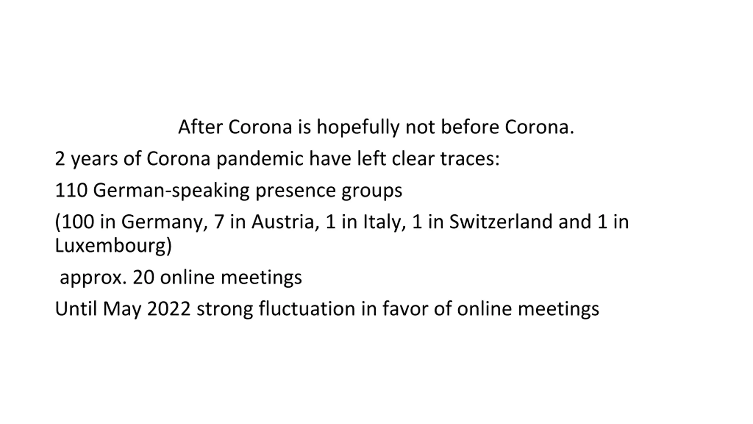 After Corona is hopefully not before Corona. 2 years of Corona pandemic have left clear traces: 110 German-speaking presence groups (100 in Germany, 7 in Austria, 1 in Italy, 1 in Switzerland and 1 in Luxembourg) approx. 20 online meetings Until May 2022 strong fluctuation in favor of online meetings