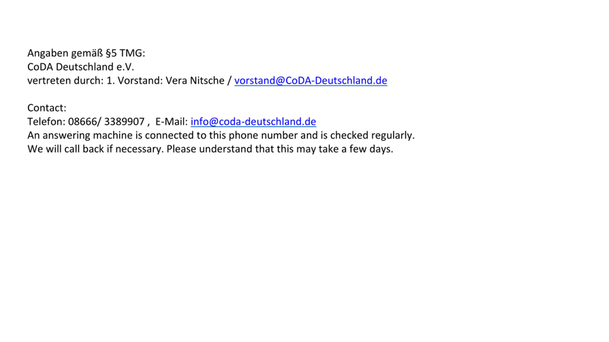 Angaben gem 5 TMG: CoDA Deutschland e.V. vertreten durch: 1. Vorstand: Vera Nitsche / vorstand@CoDA-Deutschland.de Contact: Telefon: 08666/ 3389907 , E-Mail: info@coda-deutschland.de An answering machine is connected to this phone number and is checked regularly. We will call back if necessary. Please understand that this may take a few days.