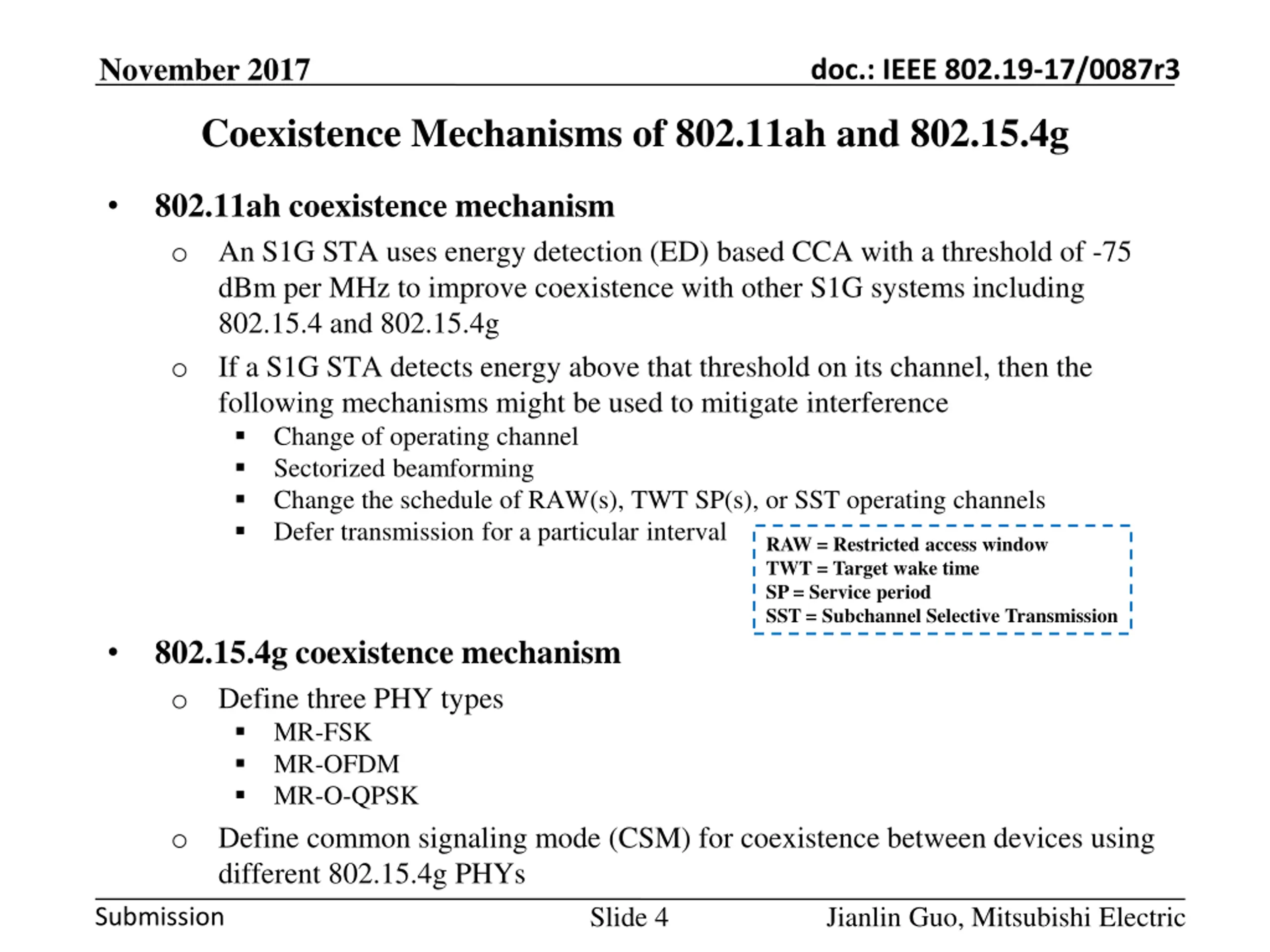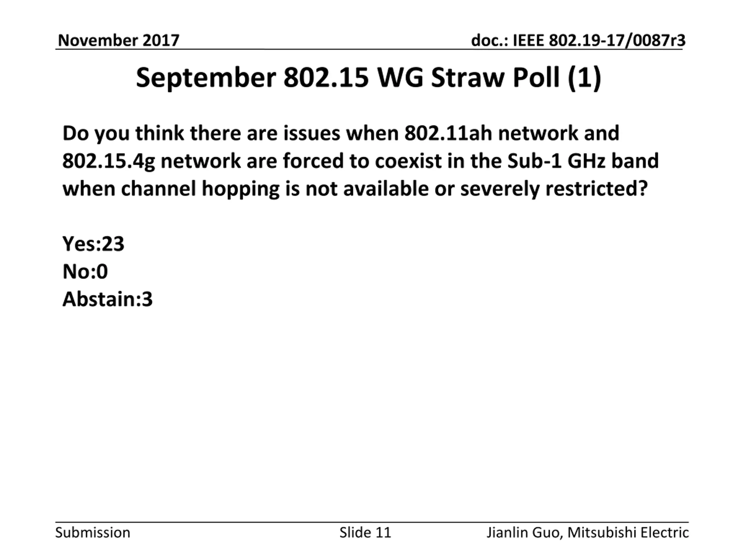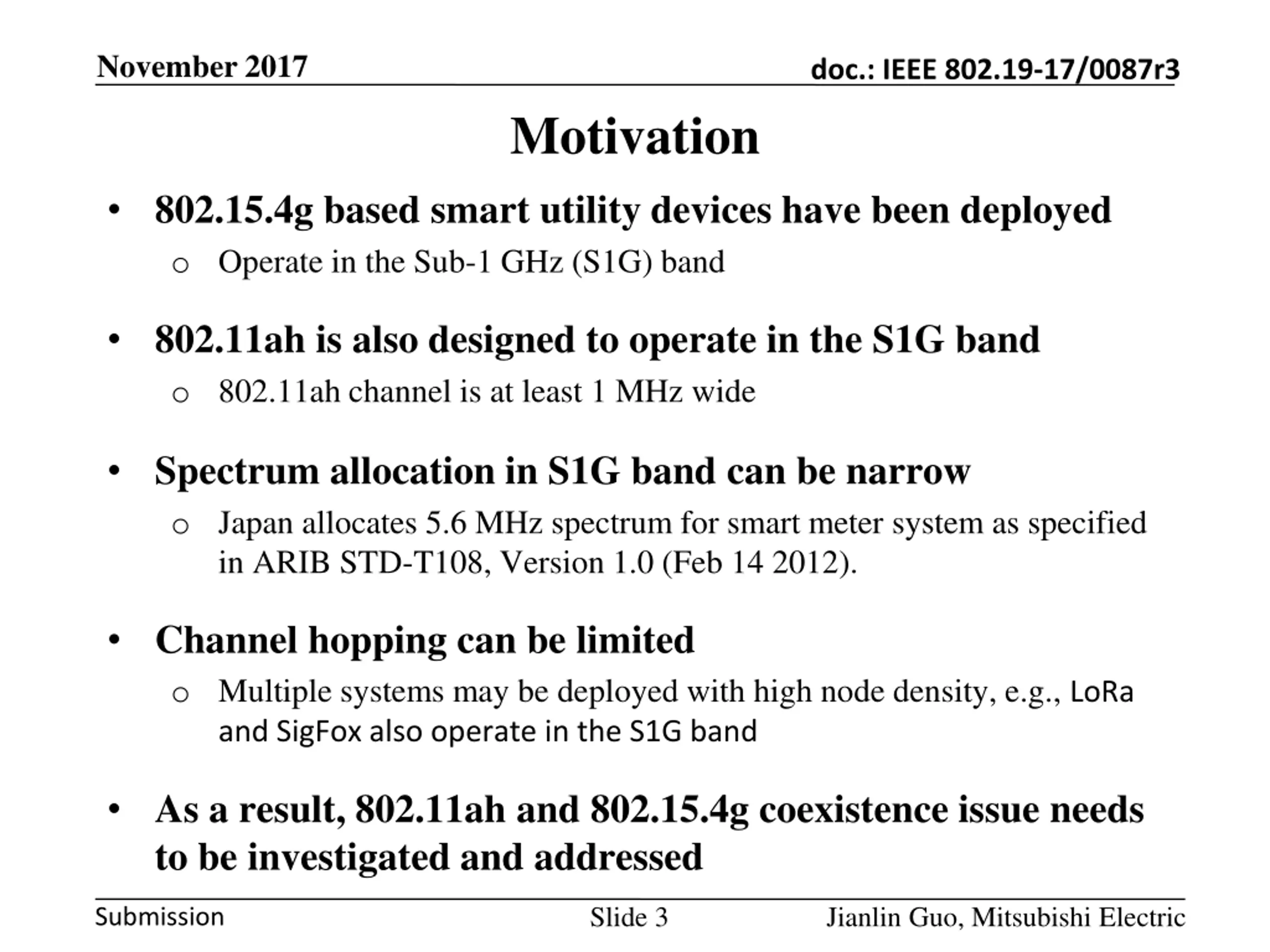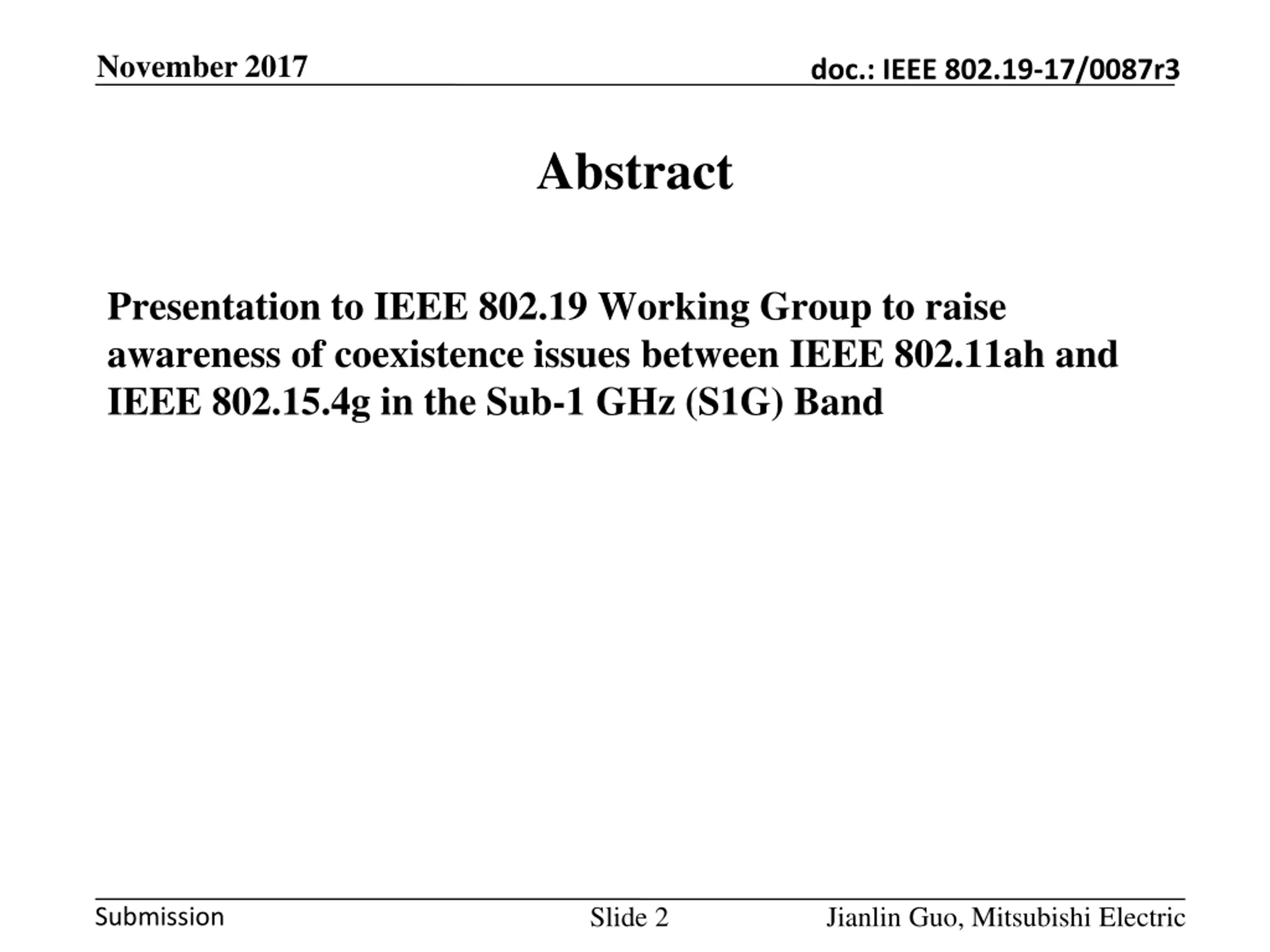 November 2017 doc.: IEEE 802.19-17/0087r3 Abstract Presentation to IEEE 802.19 Working Group to raise awareness of coexistence issues between IEEE 802.11ah and IEEE 802.15.4g in the Sub-1 GHz (S1G) Band Slide 2 Jianlin Guo, Mitsubishi Electric Submission