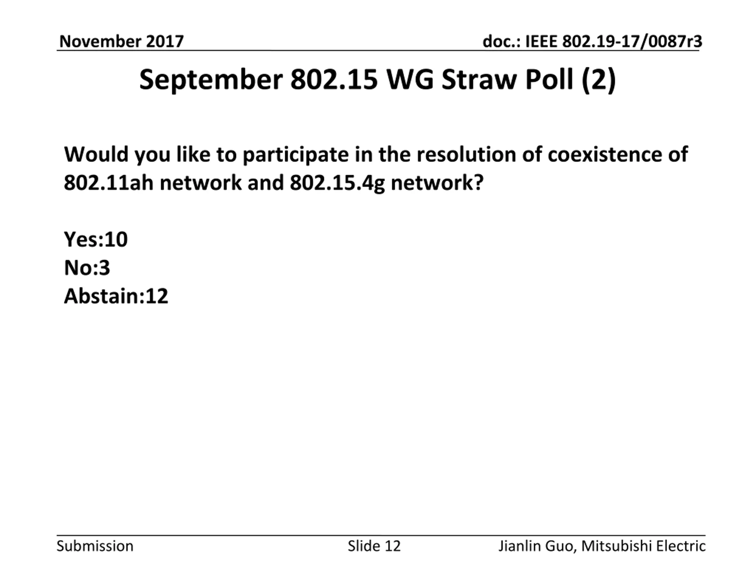 November 2017 doc.: IEEE 802.19-17/0087r3 September 802.15 WG Straw Poll (1) Do you think there are issues when 802.11ah network and 802.15.4g network are forced to coexist in the Sub-1 GHz band when channel hopping is not available or severely restricted? Yes:23 No:0 Abstain:3 Submission Slide 11 Jianlin Guo, Mitsubishi Electric