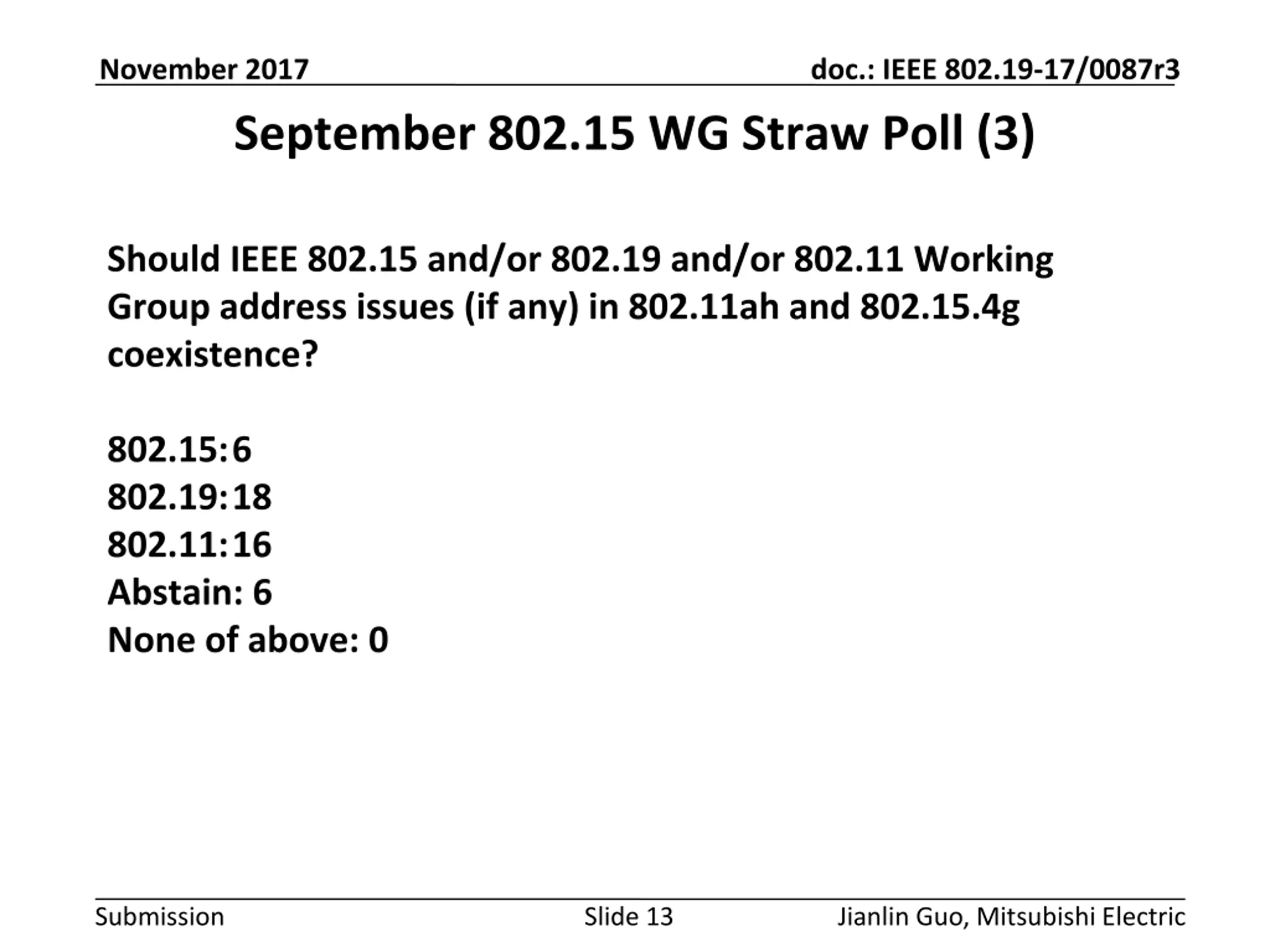 November 2017 doc.: IEEE 802.19-17/0087r3 September 802.15 WG Straw Poll (2) Would you like to participate in the resolution of coexistence of 802.11ah network and 802.15.4g network? Yes:10 No:3 Abstain:12 Submission Slide 12 Jianlin Guo, Mitsubishi Electric