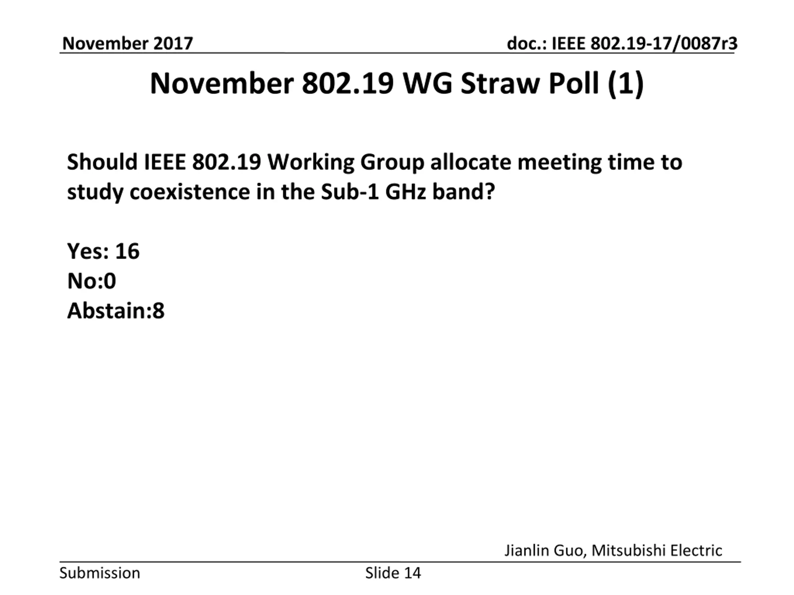 November 2017 doc.: IEEE 802.19-17/0087r3 November 802.19 WG Straw Poll (1) Should IEEE 802.19 Working Group allocate meeting time to study coexistence in the Sub-1 GHz band? Yes: 16 No:0 Abstain:8 Jianlin Guo, Mitsubishi Electric Submission Slide 14