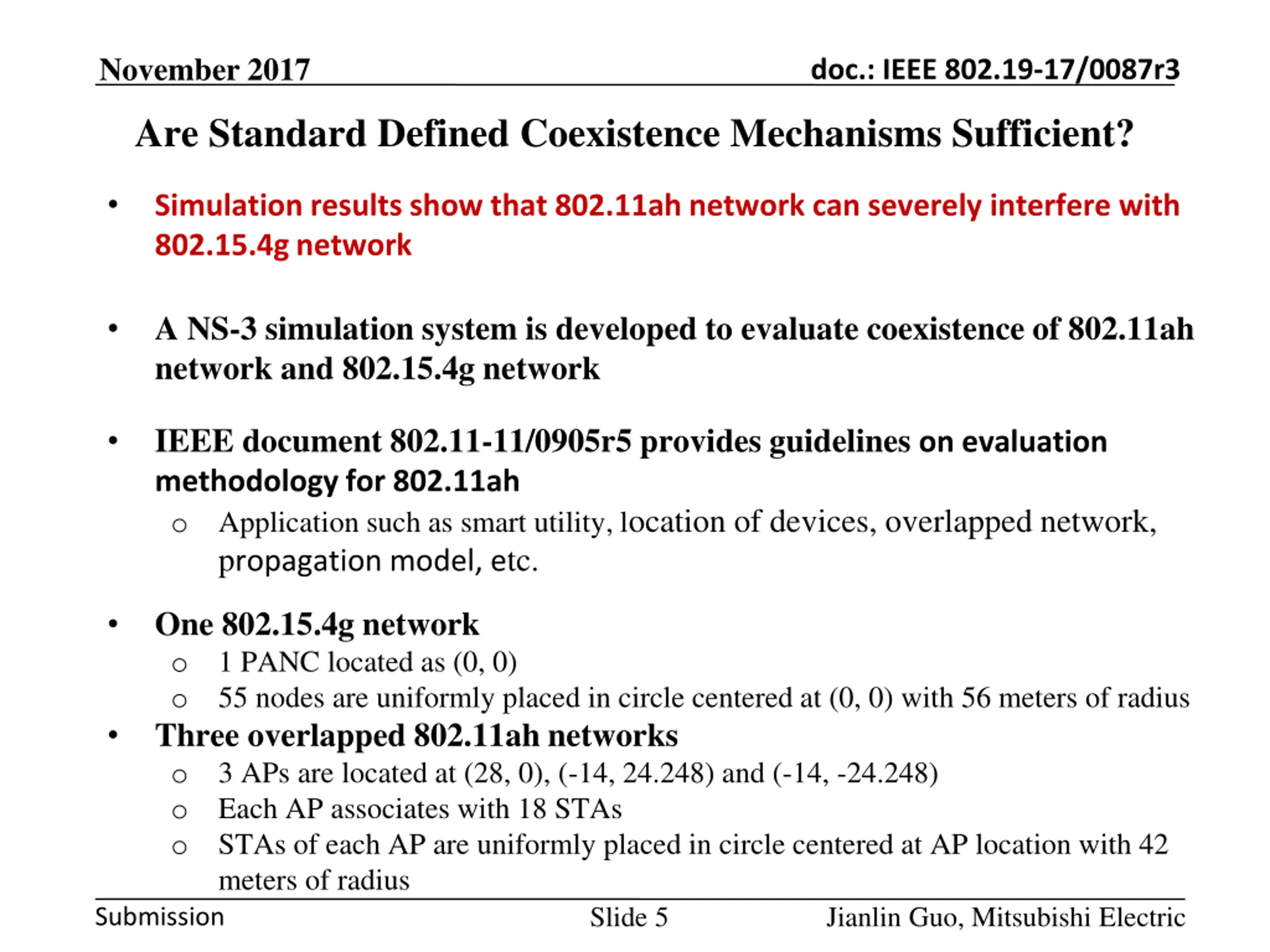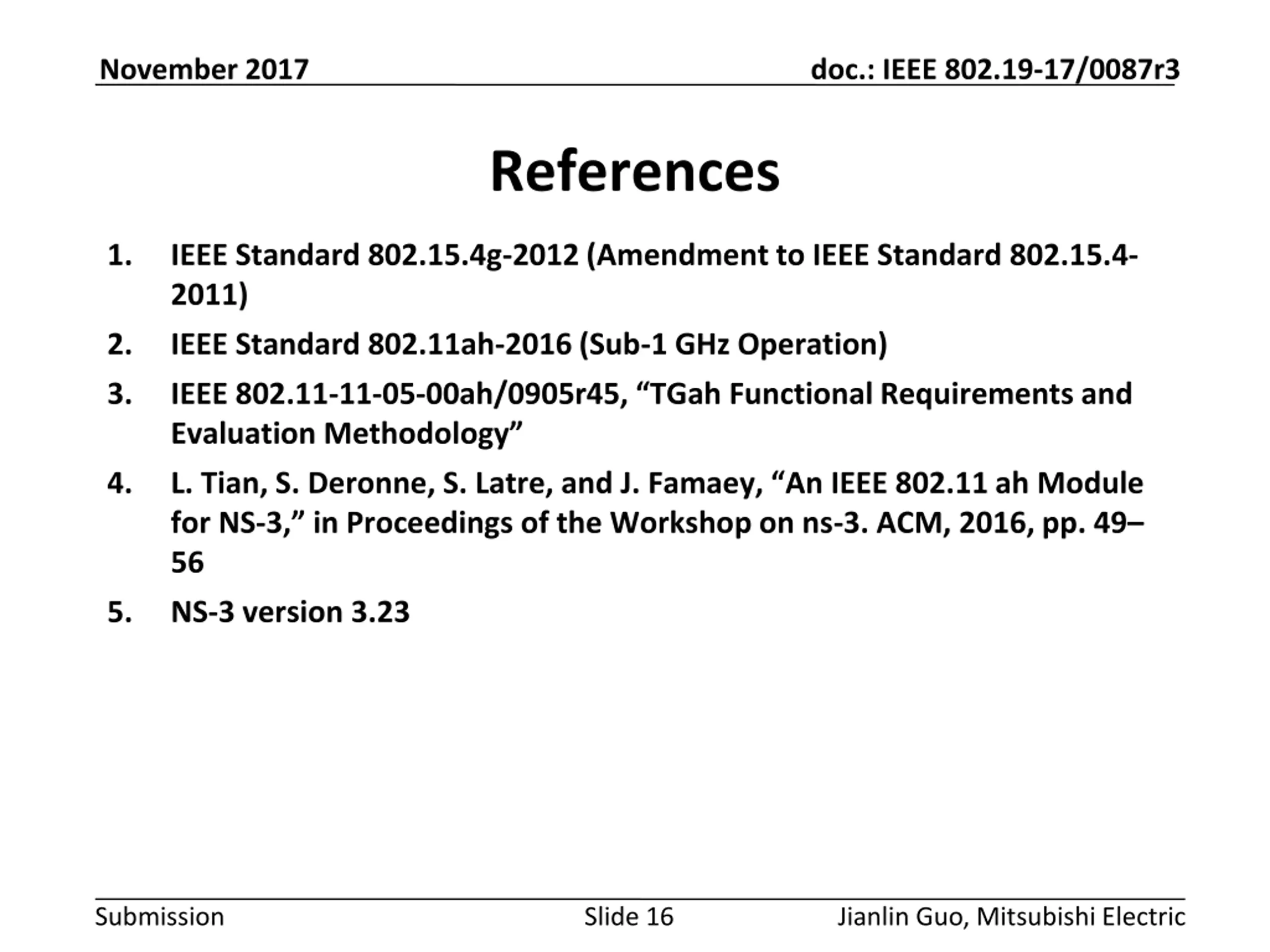 November 2017 doc.: IEEE 802.19-17/0087r3 References 1. IEEE Standard 802.15.4g-2012 (Amendment to IEEE Standard 802.15.4- 2011) IEEE Standard 802.11ah-2016 (Sub-1 GHz Operation) IEEE 802.11-11-05-00ah/0905r45, TGah Functional Requirements and Evaluation Methodology L. Tian, S. Deronne, S. Latre, and J. Famaey, An IEEE 802.11 ah Module for NS-3, in Proceedings of the Workshop on ns-3. ACM, 2016, pp. 49 56 NS-3 version 3.23 2. 3. 4. 5. Submission Slide 16 Jianlin Guo, Mitsubishi Electric