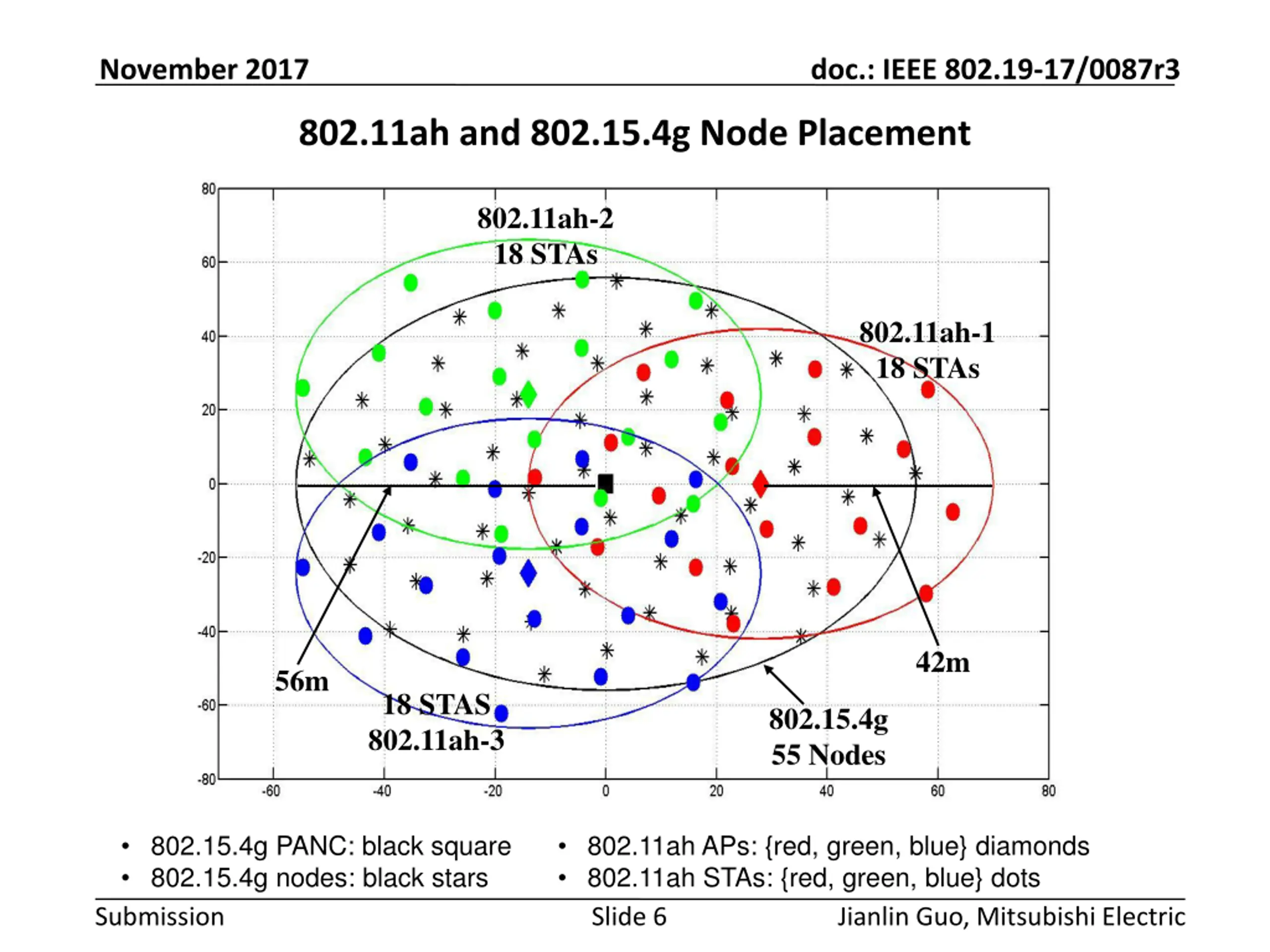 November 2017 doc.: IEEE 802.19-17/0087r3 Are Standard Defined Coexistence Mechanisms Sufficient? Simulation results show that 802.11ah network can severely interfere with 802.15.4g network A NS-3 simulation system is developed to evaluate coexistence of 802.11ah network and 802.15.4g network IEEE document 802.11-11/0905r5 provides guidelines on evaluation methodology for 802.11ah o Application such as smart utility, location of devices, overlapped network, propagation model, etc. One 802.15.4g network o 1 PANC located as (0, 0) o 55 nodes are uniformly placed in circle centered at (0, 0) with 56 meters of radius Three overlapped 802.11ah networks o 3 APs are located at (28, 0), (-14, 24.248) and (-14, -24.248) o Each AP associates with 18 STAs o STAs of each AP are uniformly placed in circle centered at AP location with 42 meters of radius Slide 5 Jianlin Guo, Mitsubishi Electric Submission