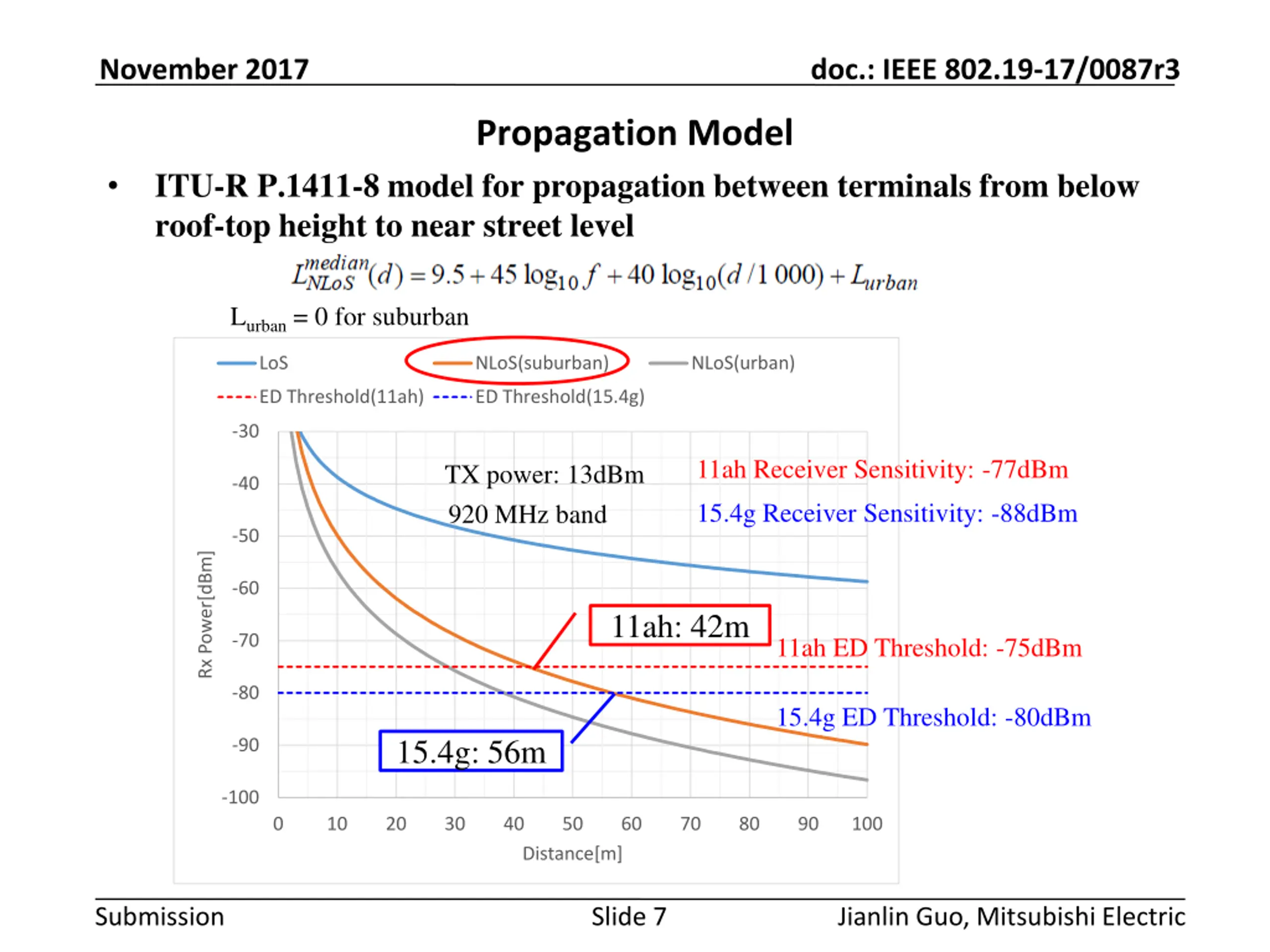 November 2017 doc.: IEEE 802.19-17/0087r3 Propagation Model ITU-R P.1411-8 model for propagation between terminals from below roof-top height to near street level Lurban = 0 for suburban LoS NLoS(suburban) NLoS(urban) ED Threshold(11ah) ED Threshold(15.4g) -30 11ah Receiver Sensitivity: -77dBm TX power: 13dBm 920 MHz band -40 15.4g Receiver Sensitivity: -88dBm -50 Rx Power[dBm] -60 11ah: 42m -70 11ah ED Threshold: -75dBm -80 15.4g ED Threshold: -80dBm 15.4g: 56m -90 -100 0 10 20 30 40 50 60 70 80 90 100 Distance[m] Submission Slide 7 Jianlin Guo, Mitsubishi Electric