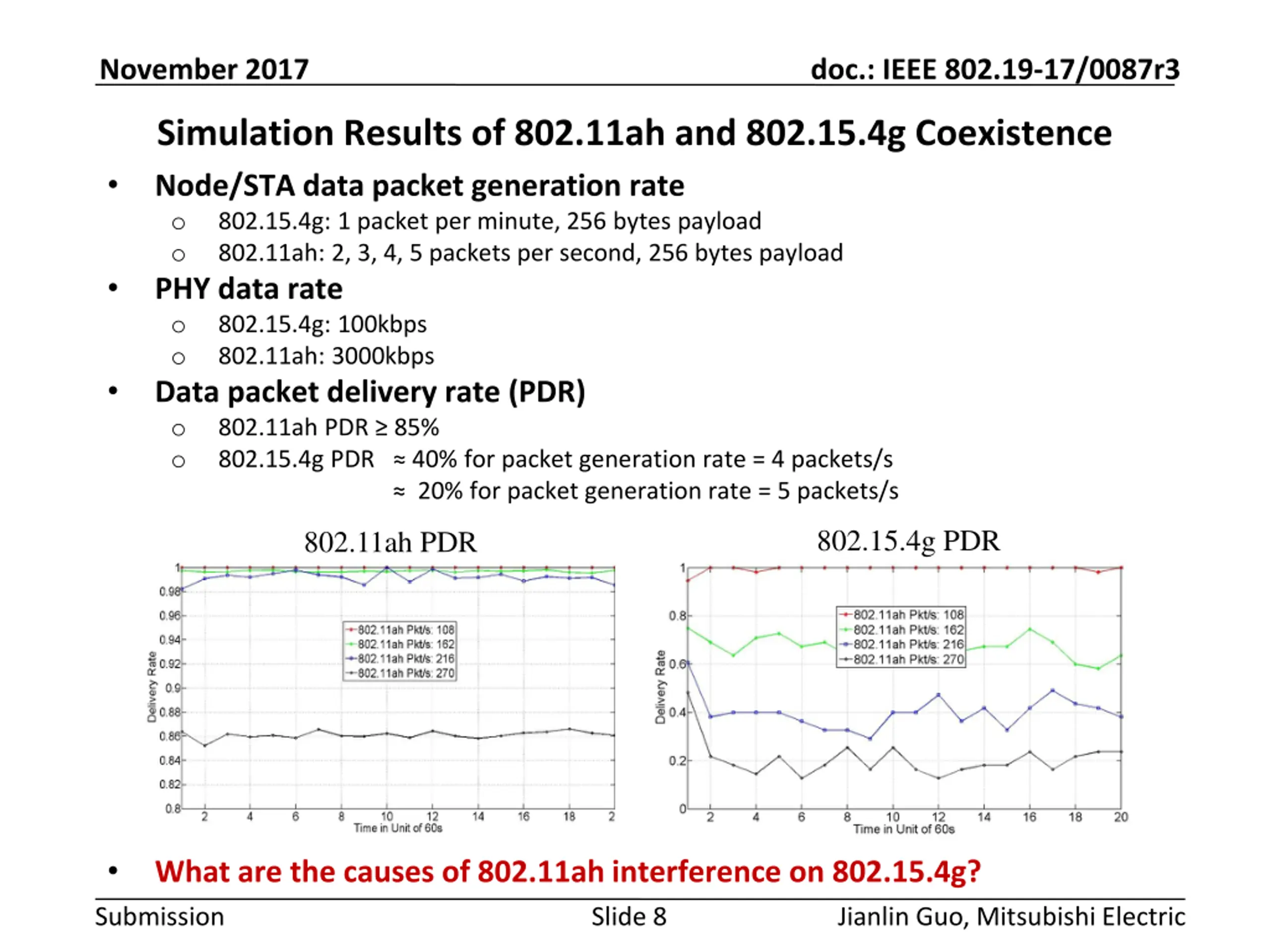November 2017 doc.: IEEE 802.19-17/0087r3 Simulation Results of 802.11ah and 802.15.4g Coexistence Node/STA data packet generation rate o 802.15.4g: 1 packet per minute, 256 bytes payload o 802.11ah: 2, 3, 4, 5 packets per second, 256 bytes payload PHY data rate o 802.15.4g: 100kbps o 802.11ah: 3000kbps Data packet delivery rate (PDR) o 802.11ah PDR 85% o 802.15.4g PDR 40% for packet generation rate = 4 packets/s 20% for packet generation rate = 5 packets/s 802.15.4g PDR 802.11ah PDR What are the causes of 802.11ah interference on 802.15.4g? Submission Slide 8 Jianlin Guo, Mitsubishi Electric