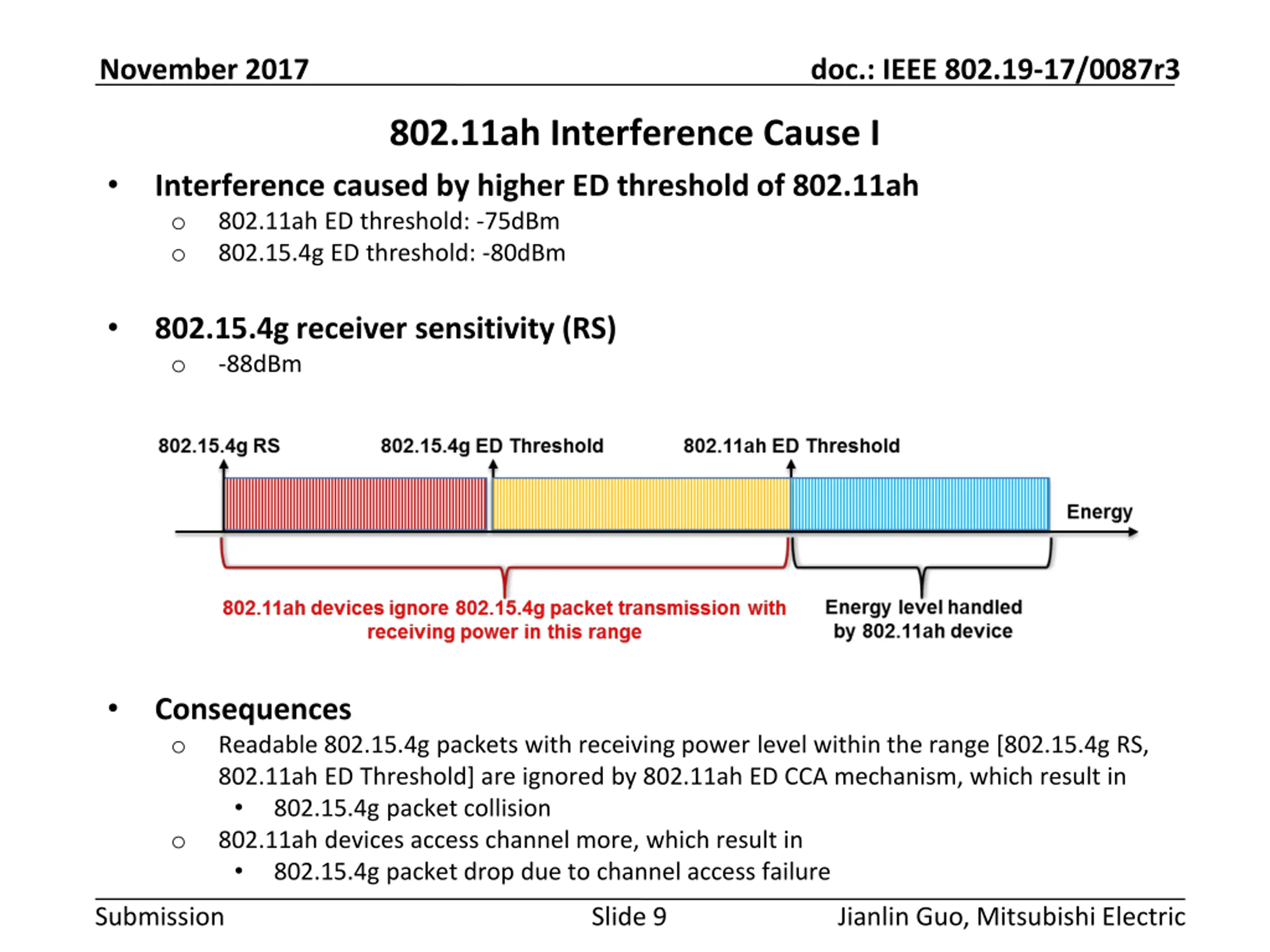 November 2017 doc.: IEEE 802.19-17/0087r3 802.11ah Interference Cause I Interference caused by higher ED threshold of 802.11ah o 802.11ah ED threshold: -75dBm o 802.15.4g ED threshold: -80dBm 802.15.4g receiver sensitivity (RS) o -88dBm Consequences o Readable 802.15.4g packets with receiving power level within the range [802.15.4g RS, 802.11ah ED Threshold] are ignored by 802.11ah ED CCA mechanism, which result in 802.15.4g packet collision o 802.11ah devices access channel more, which result in 802.15.4g packet drop due to channel access failure Submission Slide 9 Jianlin Guo, Mitsubishi Electric