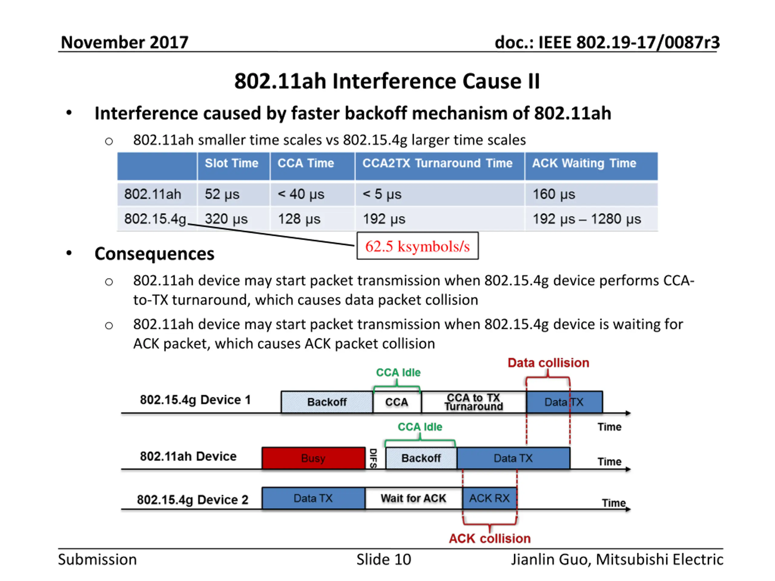 November 2017 doc.: IEEE 802.19-17/0087r3 802.11ah Interference Cause II Interference caused by faster backoff mechanism of 802.11ah o 802.11ah smaller time scales vs 802.15.4g larger time scales 62.5 ksymbols/s Consequences o 802.11ah device may start packet transmission when 802.15.4g device performs CCA- to-TX turnaround, which causes data packet collision o 802.11ah device may start packet transmission when 802.15.4g device is waiting for ACK packet, which causes ACK packet collision Submission Slide 10 Jianlin Guo, Mitsubishi Electric