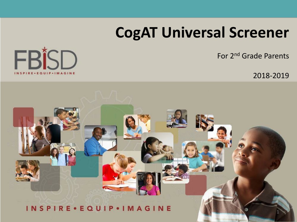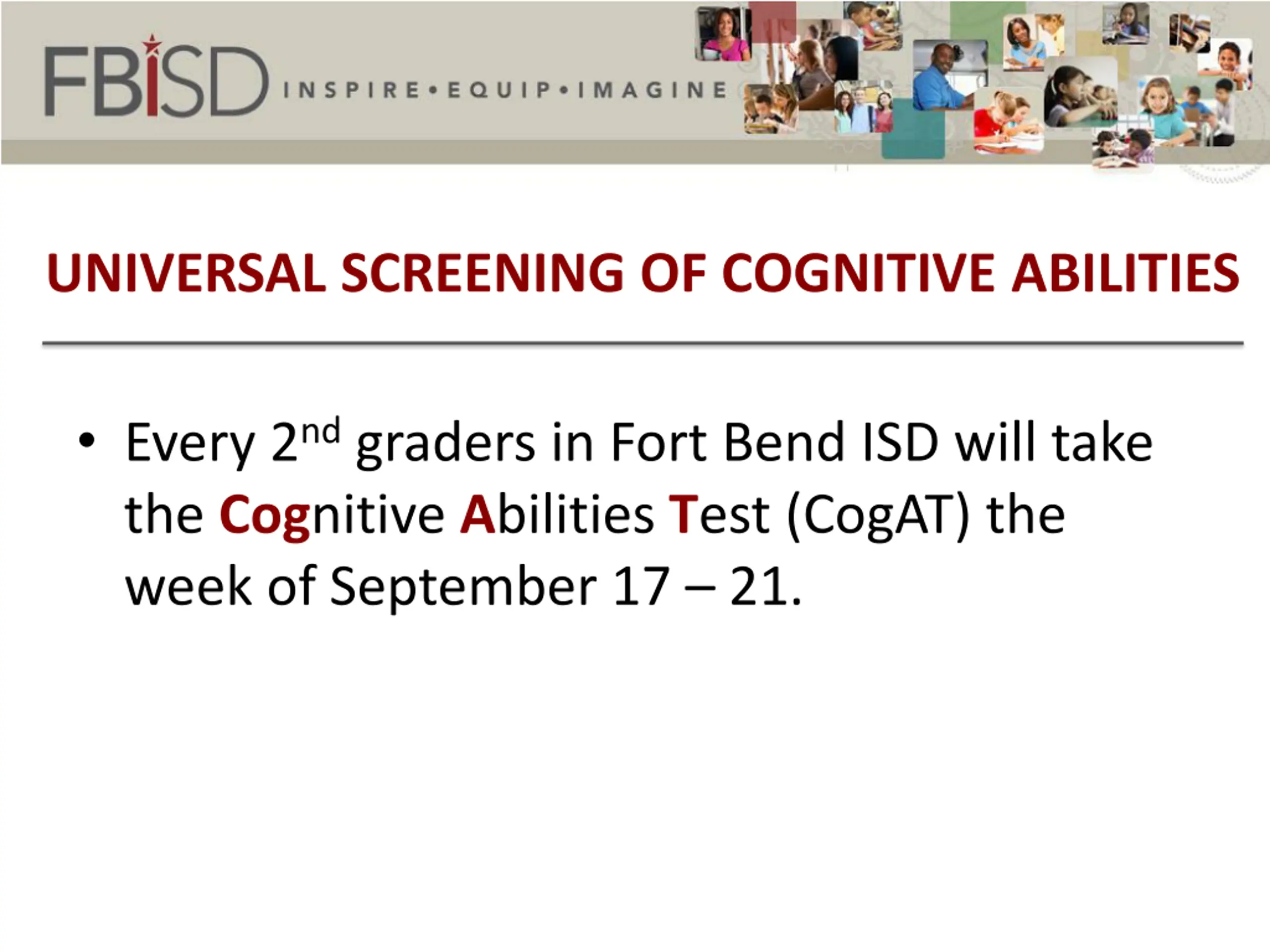 UNIVERSAL SCREENING OF COGNITIVE ABILITIES Every 2nd graders in Fort Bend ISD will take the Cognitive Abilities Test (CogAT) the week of September 17 21.