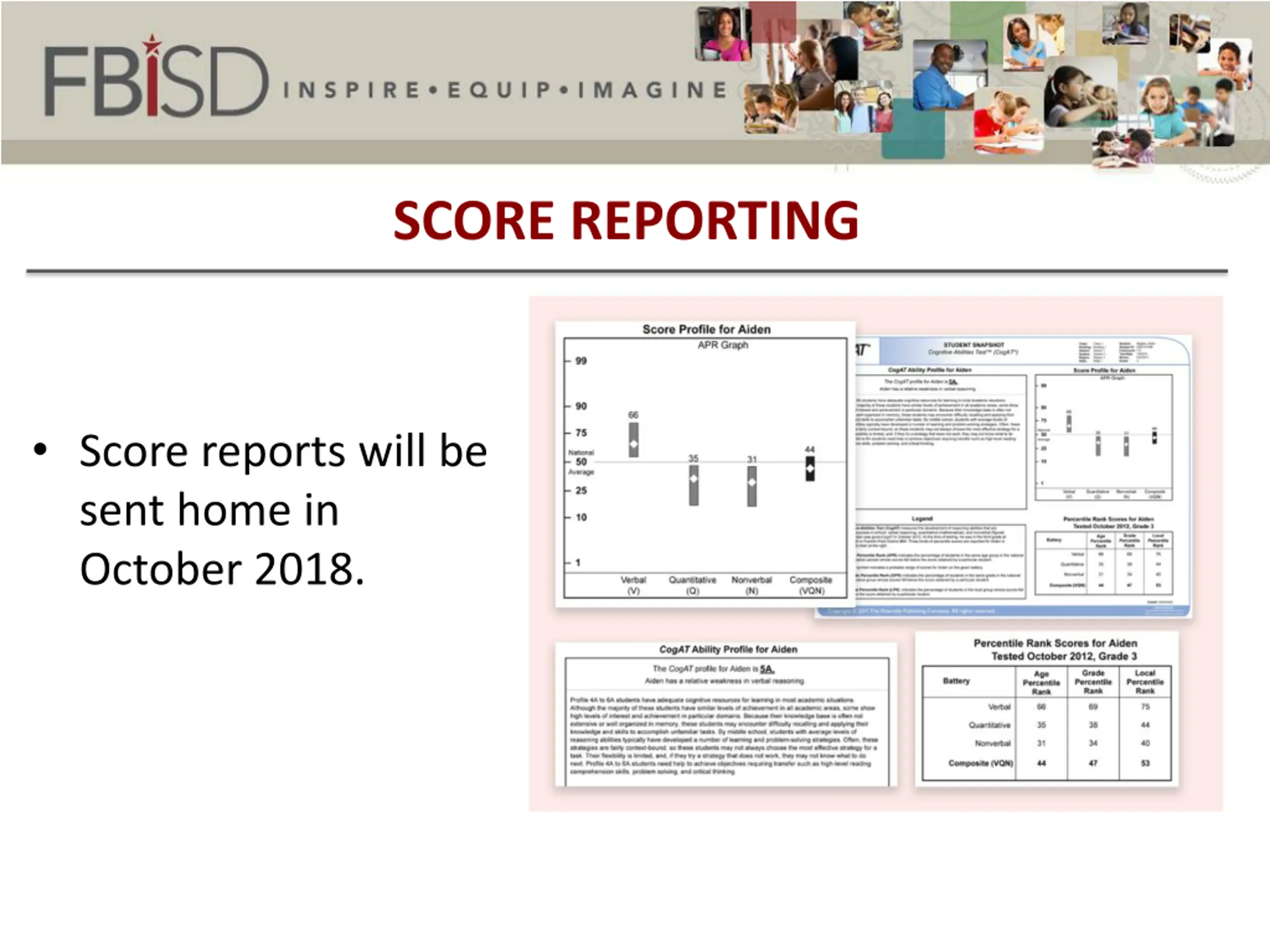 SCORE REPORTING Score reports will be sent home in October 2018.