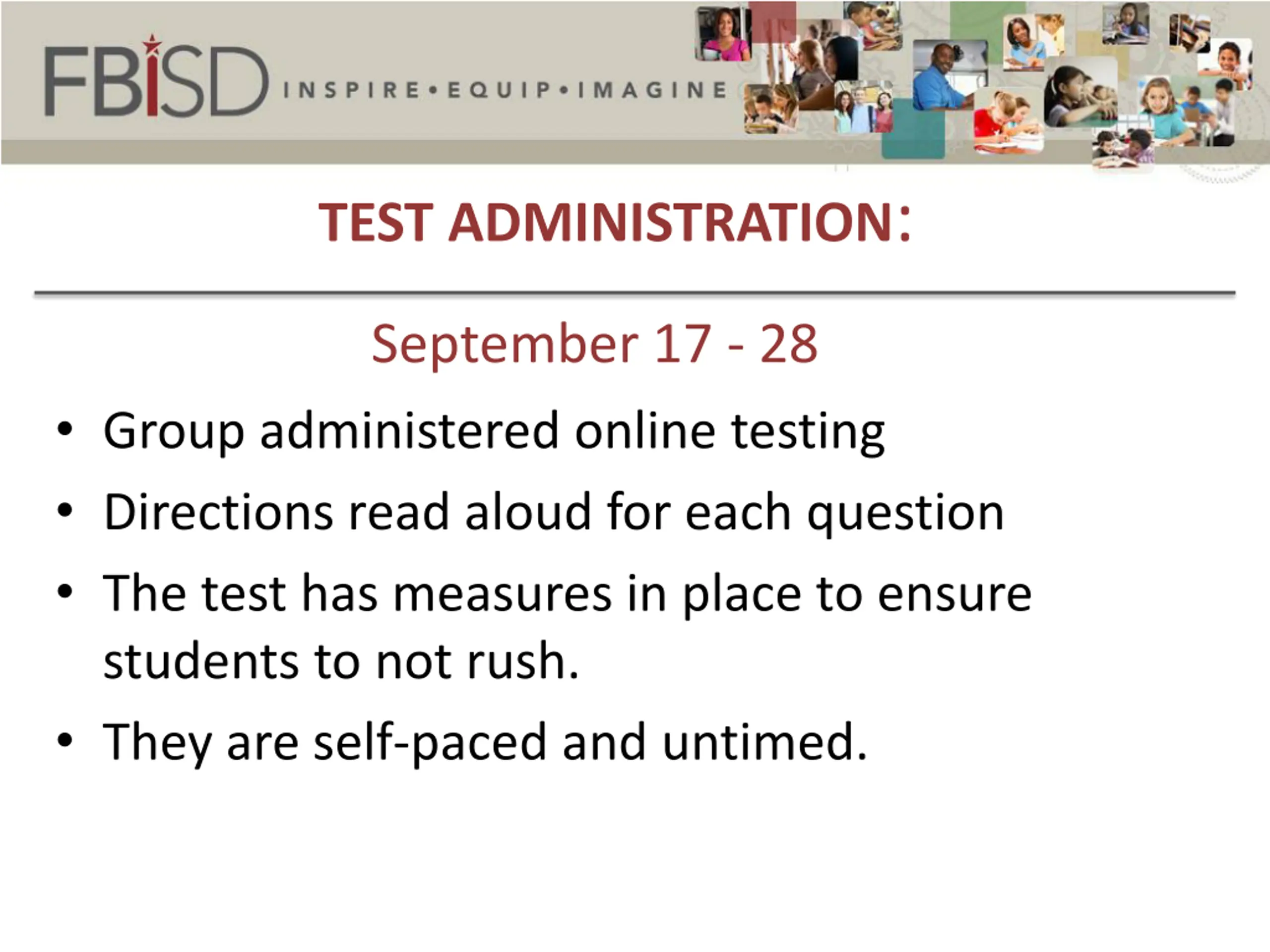 TEST ADMINISTRATION: September 17 - 28 Group administered online testing Directions read aloud for each question The test has measures in place to ensure students to not rush. They are self-paced and untimed.