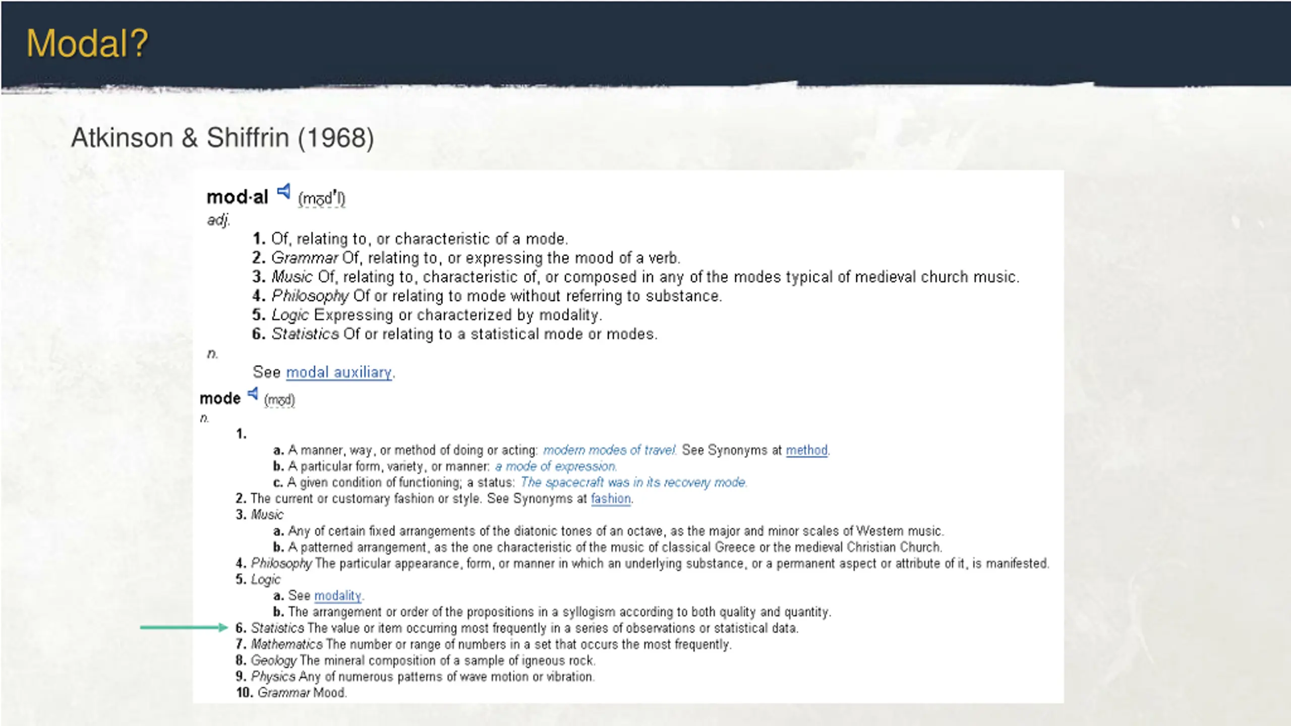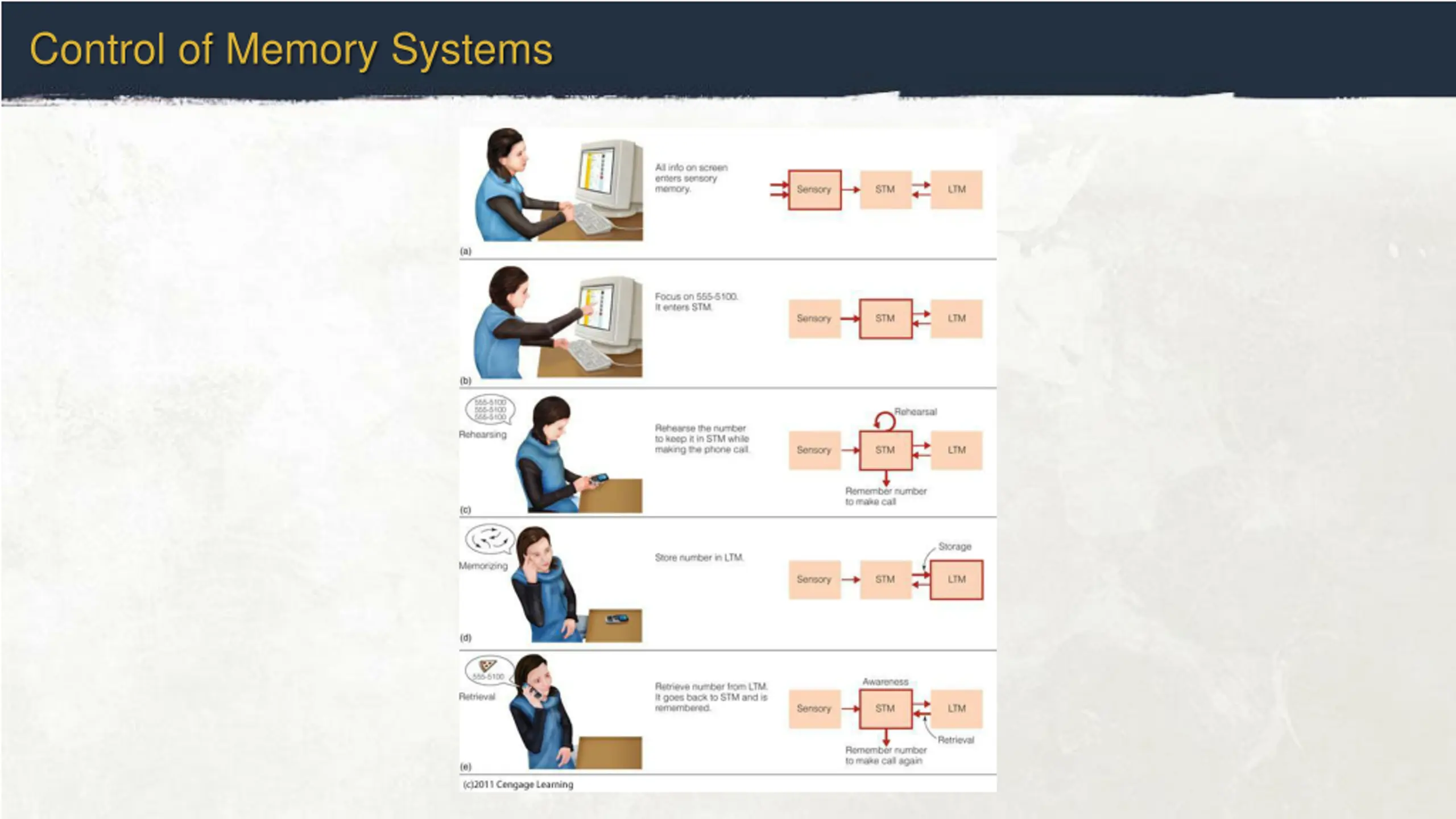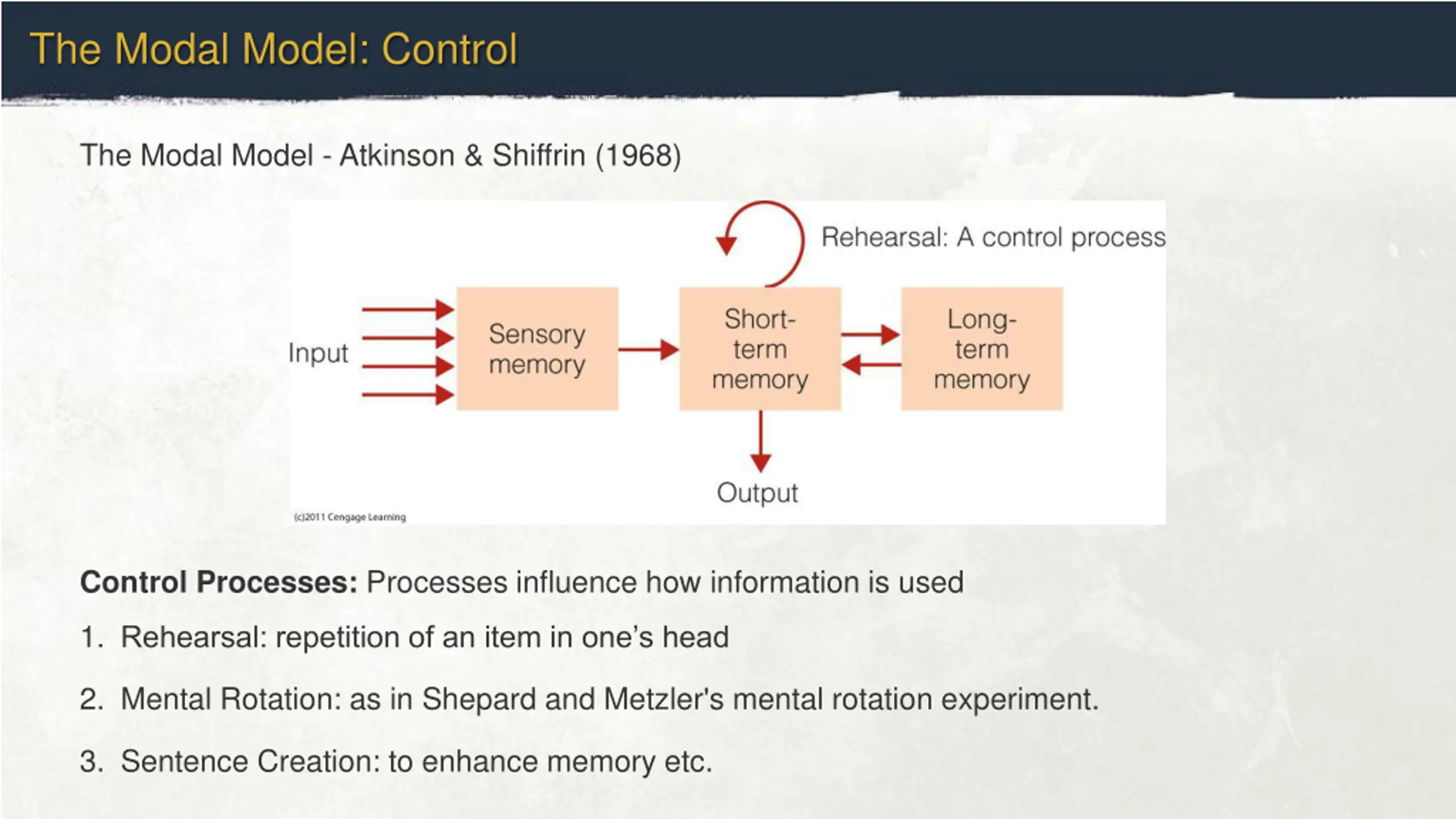 The Modal Model: Control The Modal Model - Atkinson & Shiffrin (1968) Control Processes: Processes influence how information is used 1. Rehearsal: repetition of an item in one s head 2. Mental Rotation: as in Shepard and Metzler's mental rotation experiment. 3. Sentence Creation: to enhance memory etc.