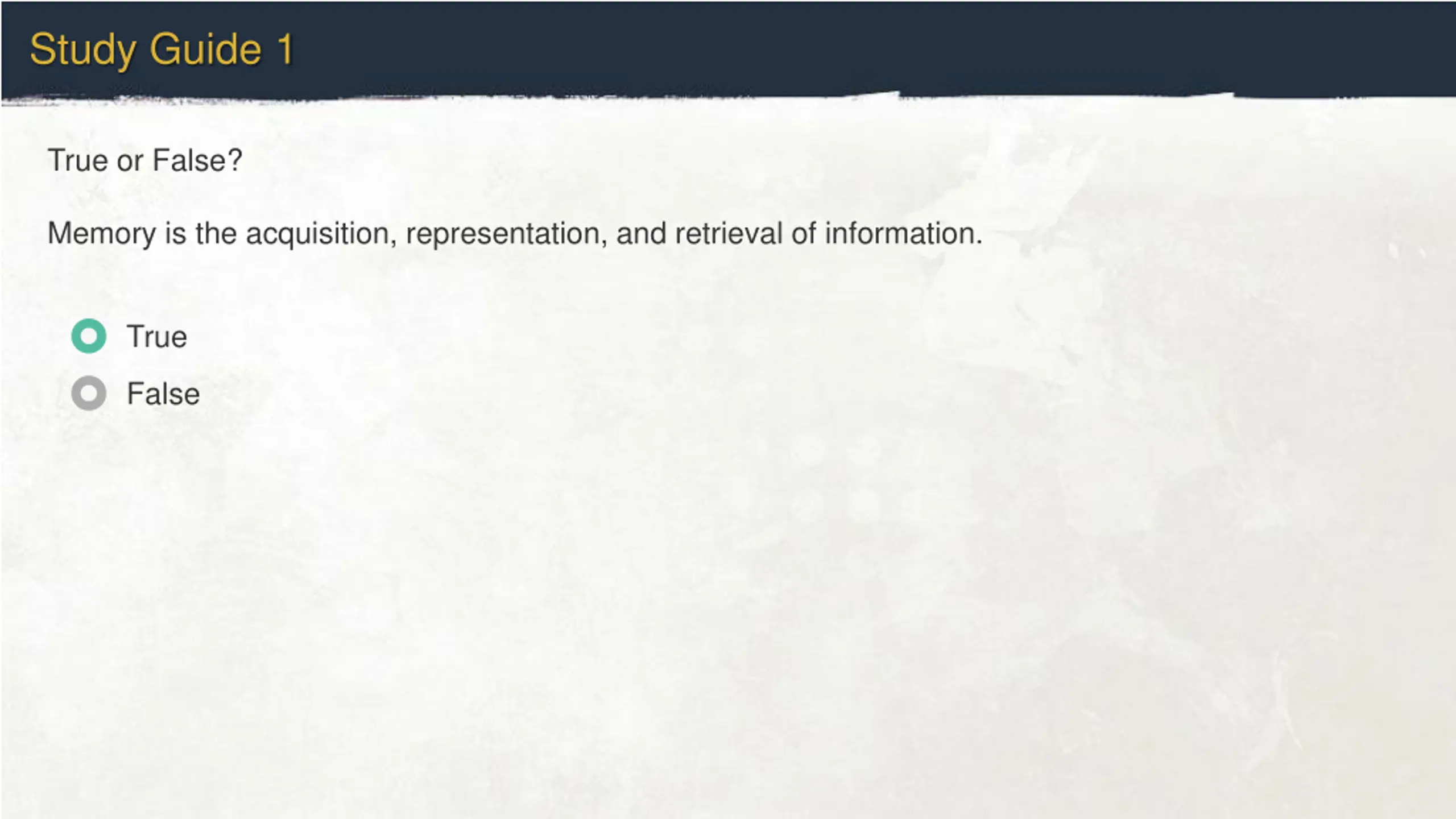Study Guide 1 True or False? Memory is the acquisition, representation, and retrieval of information. True False