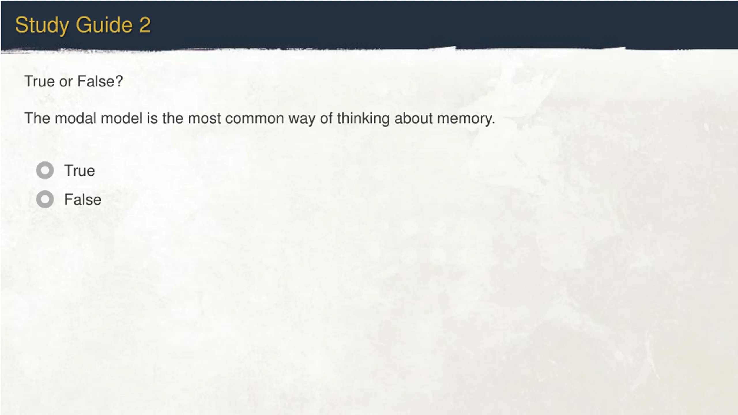 Study Guide 2 True or False? The modal model is the most common way of thinking about memory. True False