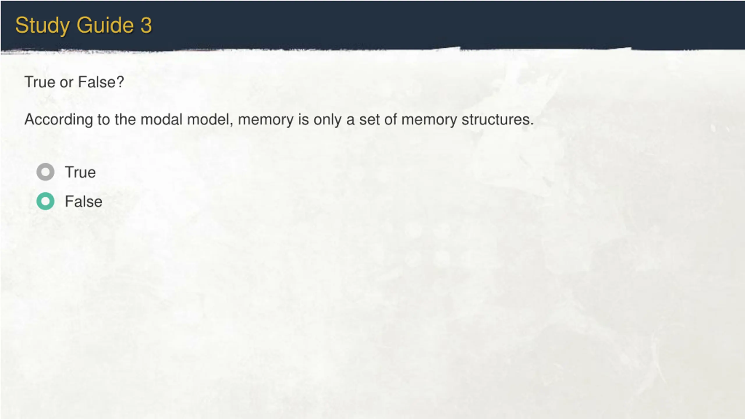 Study Guide 3 True or False? According to the modal model, memory is only a set of memory structures. True False