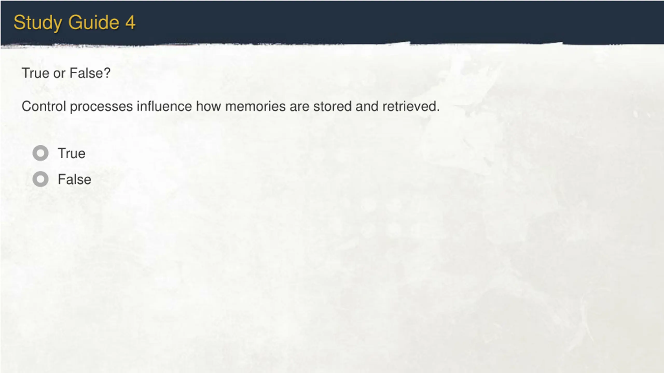 Study Guide 4 True or False? Control processes influence how memories are stored and retrieved. True False
