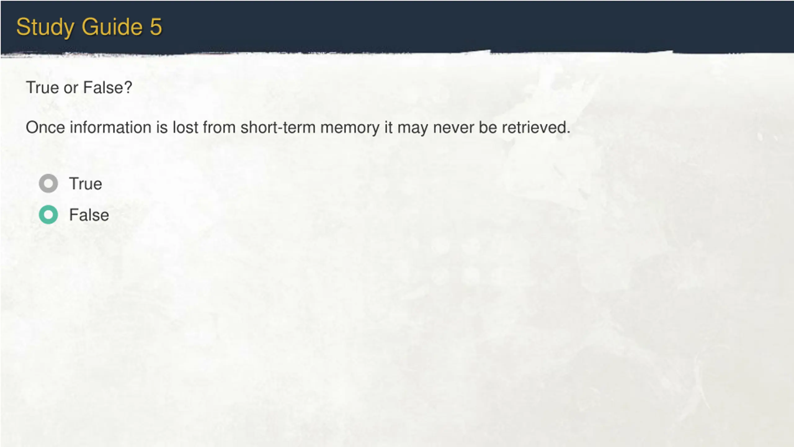 Study Guide 5 True or False? Once information is lost from short-term memory it may never be retrieved. True False