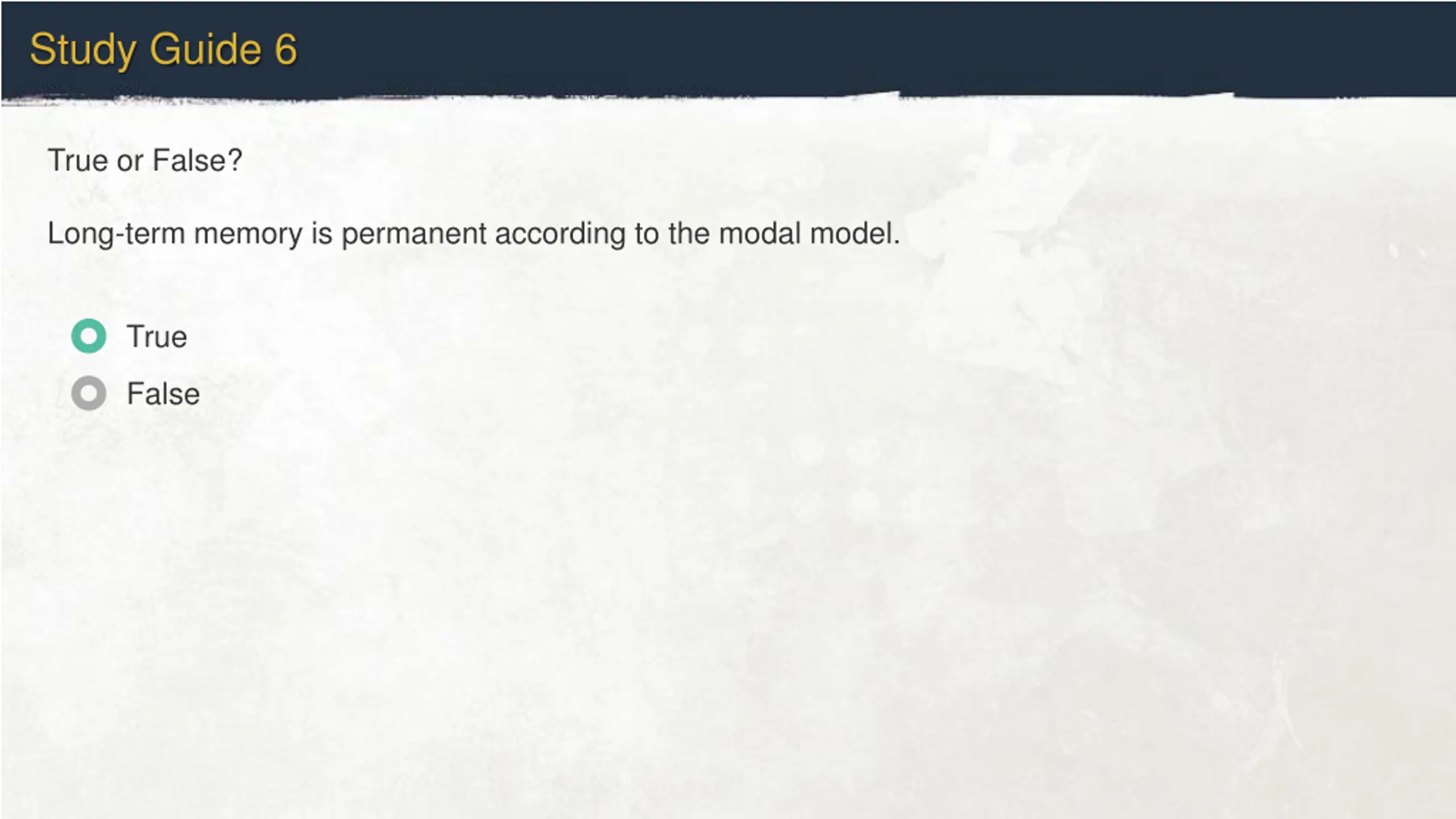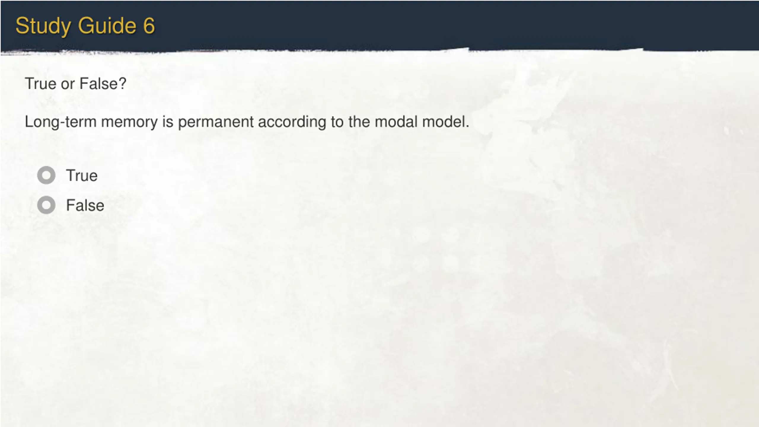 Study Guide 6 True or False? Long-term memory is permanent according to the modal model. True False