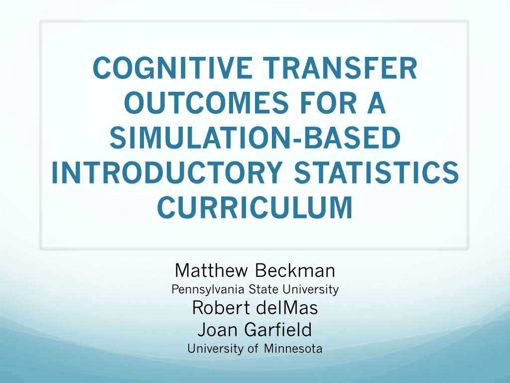 COGNITIVE TRANSFER OUTCOMES FOR A SIMULATION-BASED INTRODUCTORY STATISTICS CURRICULUM Matthew Beckman Pennsylvania State University Robert delMas Joan Garfield University of Minnesota