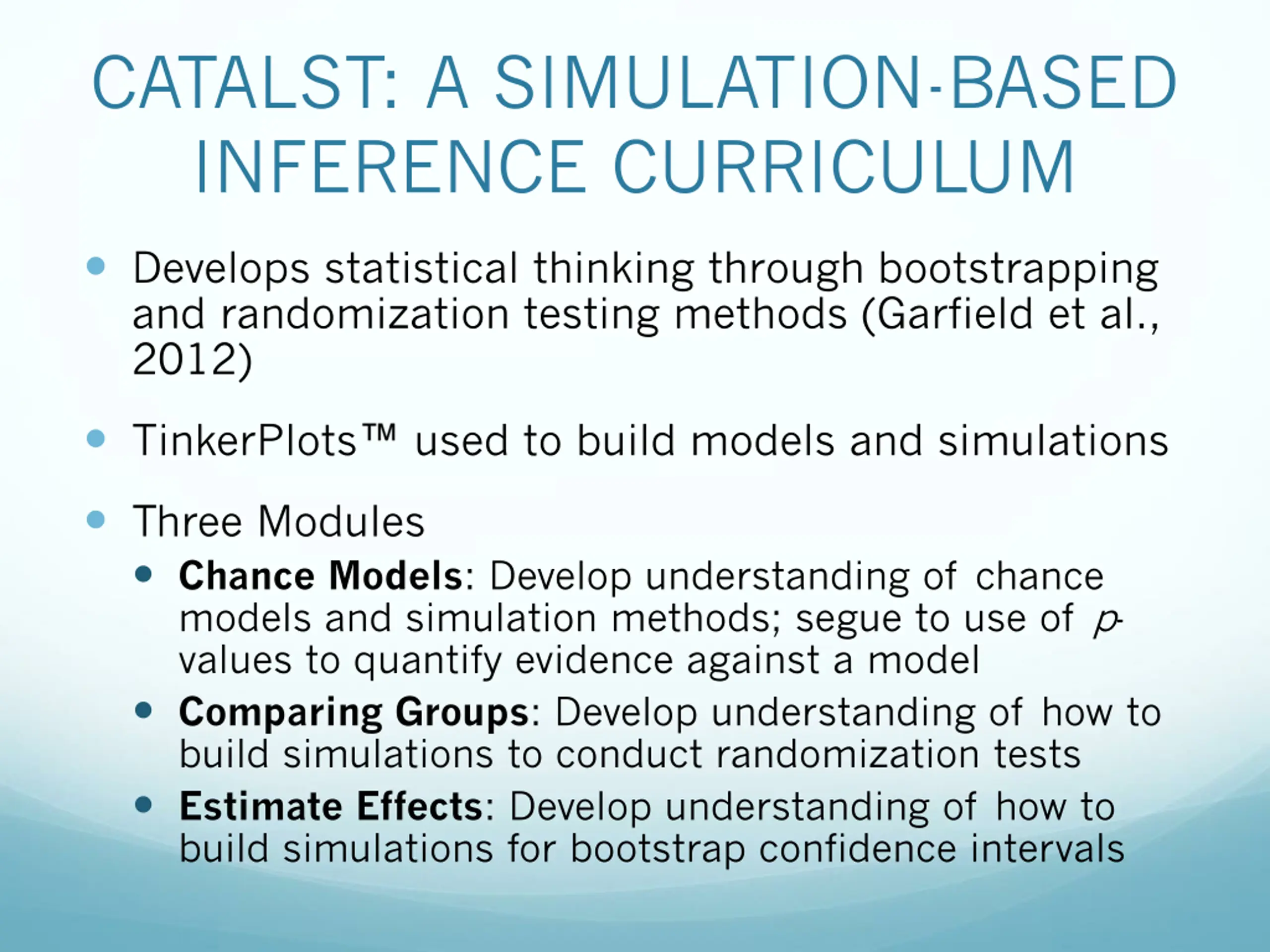CATALST: A SIMULATION-BASED INFERENCE CURRICULUM Develops statistical thinking through bootstrapping and randomization testing methods (Garfield et al., 2012) TinkerPlots used to build models and simulations Three Modules Chance Models: Develop understanding of chance models and simulation methods; segue to use of p- values to quantify evidence against a model Comparing Groups: Develop understanding of how to build simulations to conduct randomization tests Estimate Effects: Develop understanding of how to build simulations for bootstrap confidence intervals