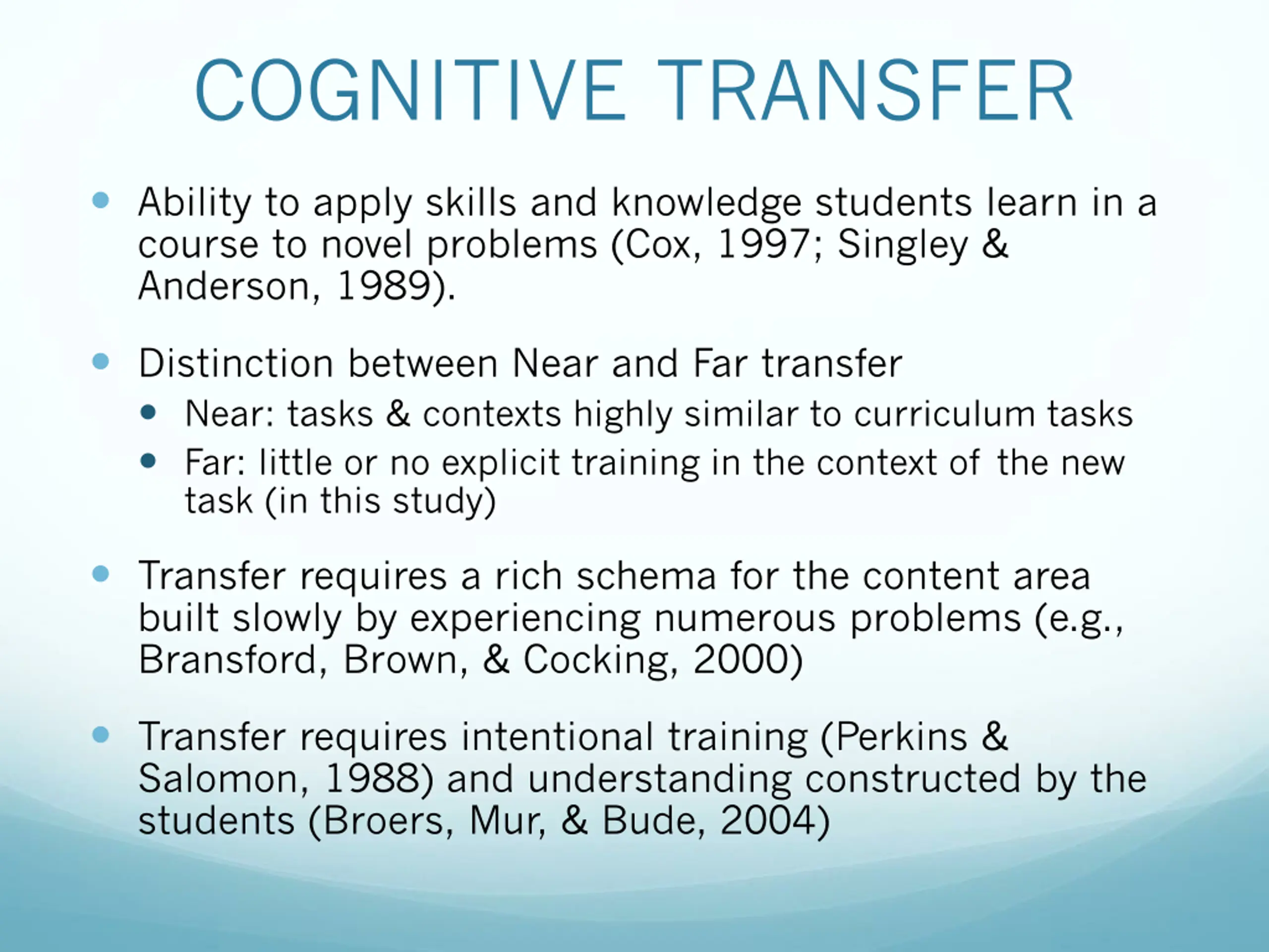 COGNITIVE TRANSFER Ability to apply skills and knowledge students learn in a course to novel problems (Cox, 1997; Singley & Anderson, 1989). Distinction between Near and Far transfer Near: tasks & contexts highly similar to curriculum tasks Far: little or no explicit training in the context of the new task (in this study) Transfer requires a rich schema for the content area built slowly by experiencing numerous problems (e.g., Bransford, Brown, & Cocking, 2000) Transfer requires intentional training (Perkins & Salomon, 1988) and understanding constructed by the students (Broers, Mur, & Bude, 2004)