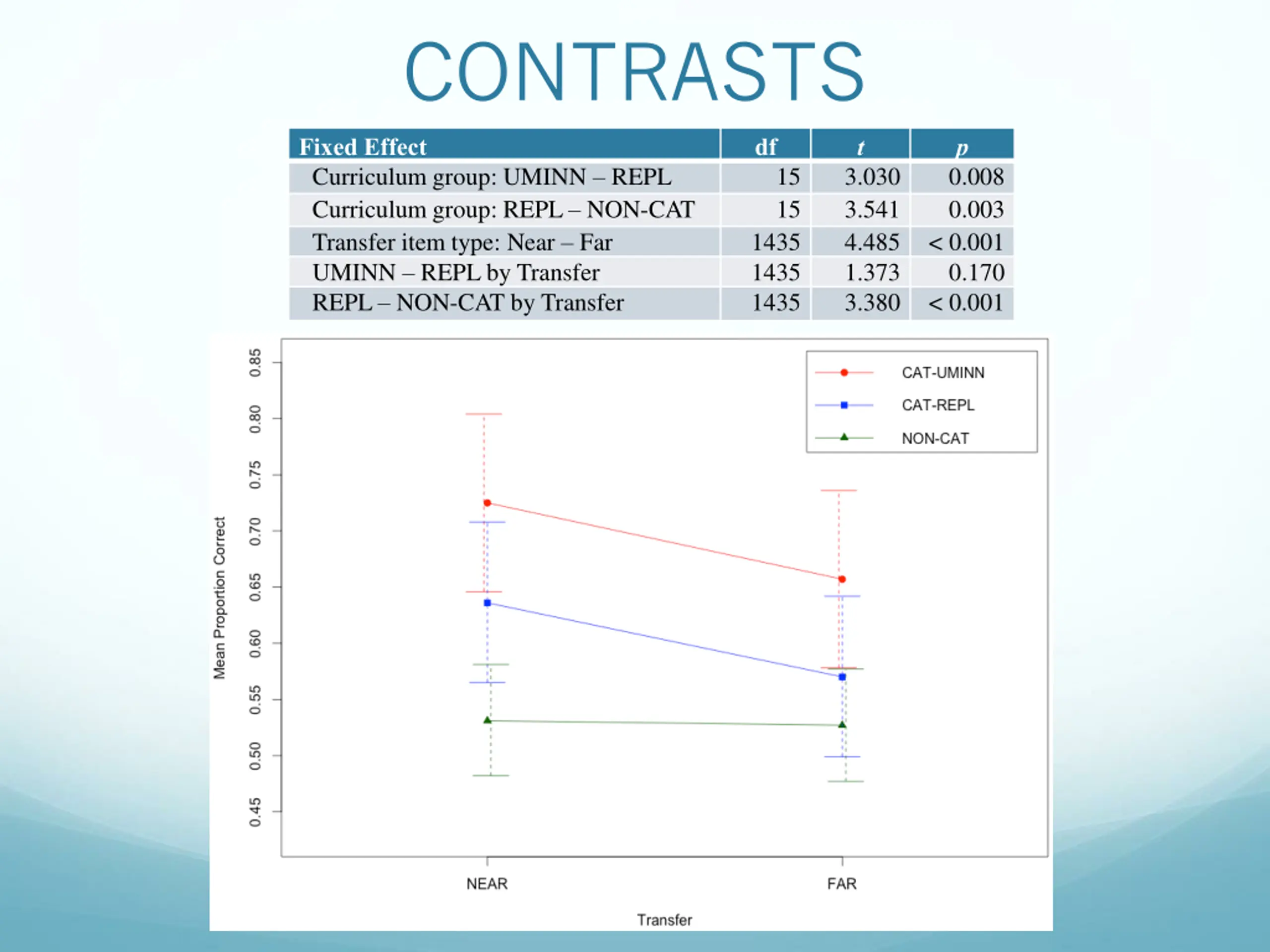 CONTRASTS Fixed Effect Curriculum group: UMINN REPL Curriculum group: REPL NON-CAT Transfer item type: Near Far UMINN REPL by Transfer REPL NON-CAT by Transfer df t p 15 15 3.030 3.541 4.485 1.373 3.380 0.008 0.003 < 0.001 0.170 < 0.001 1435 1435 1435