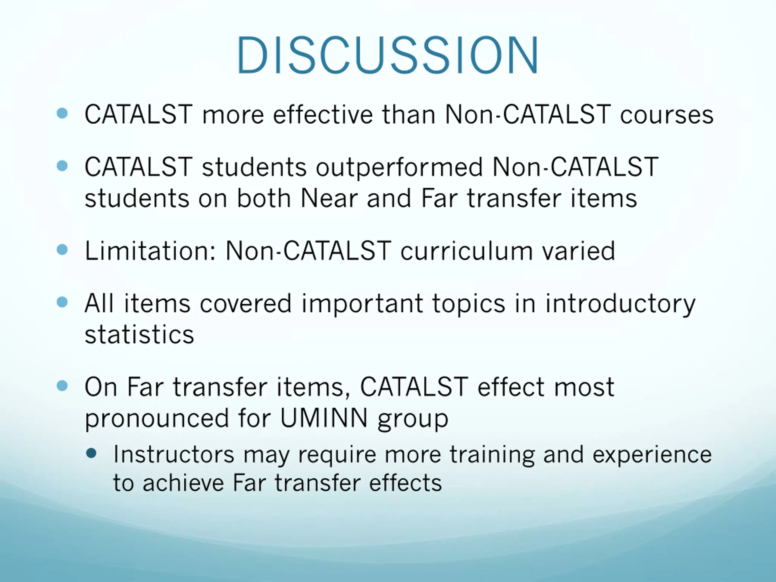 DISCUSSION CATALST more effective than Non-CATALST courses CATALST students outperformed Non-CATALST students on both Near and Far transfer items Limitation: Non-CATALST curriculum varied All items covered important topics in introductory statistics On Far transfer items, CATALST effect most pronounced for UMINN group Instructors may require more training and experience to achieve Far transfer effects