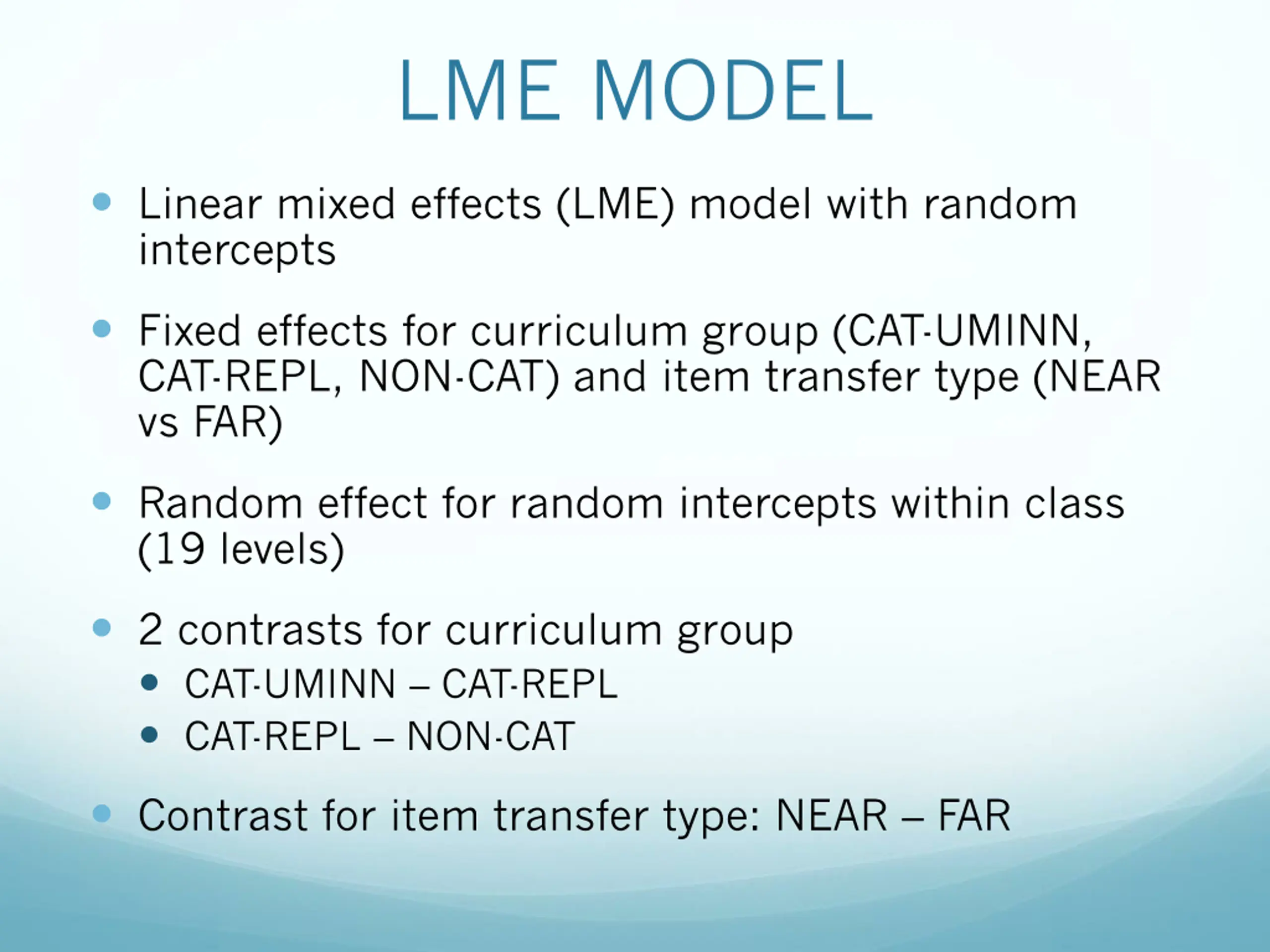 LME MODEL Linear mixed effects (LME) model with random intercepts Fixed effects for curriculum group (CAT-UMINN, CAT-REPL, NON-CAT) and item transfer type (NEAR vs FAR) Random effect for random intercepts within class (19 levels) 2 contrasts for curriculum group CAT-UMINN CAT-REPL CAT-REPL NON-CAT Contrast for item transfer type: NEAR FAR