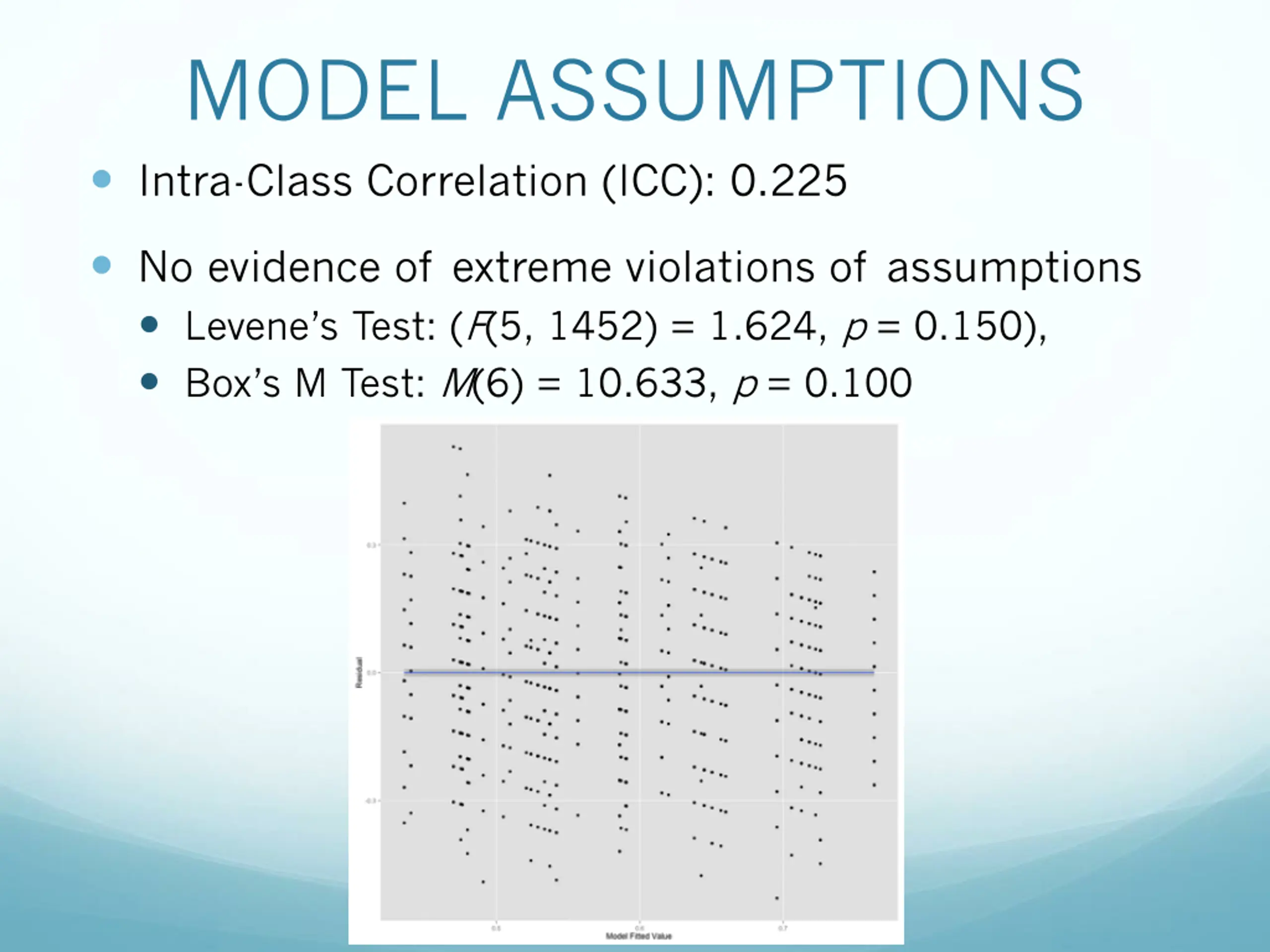 MODEL ASSUMPTIONS Intra-Class Correlation (ICC): 0.225 No evidence of extreme violations of assumptions Levene s Test: (F(5, 1452) = 1.624, p = 0.150), Box s M Test: M(6) = 10.633, p = 0.100