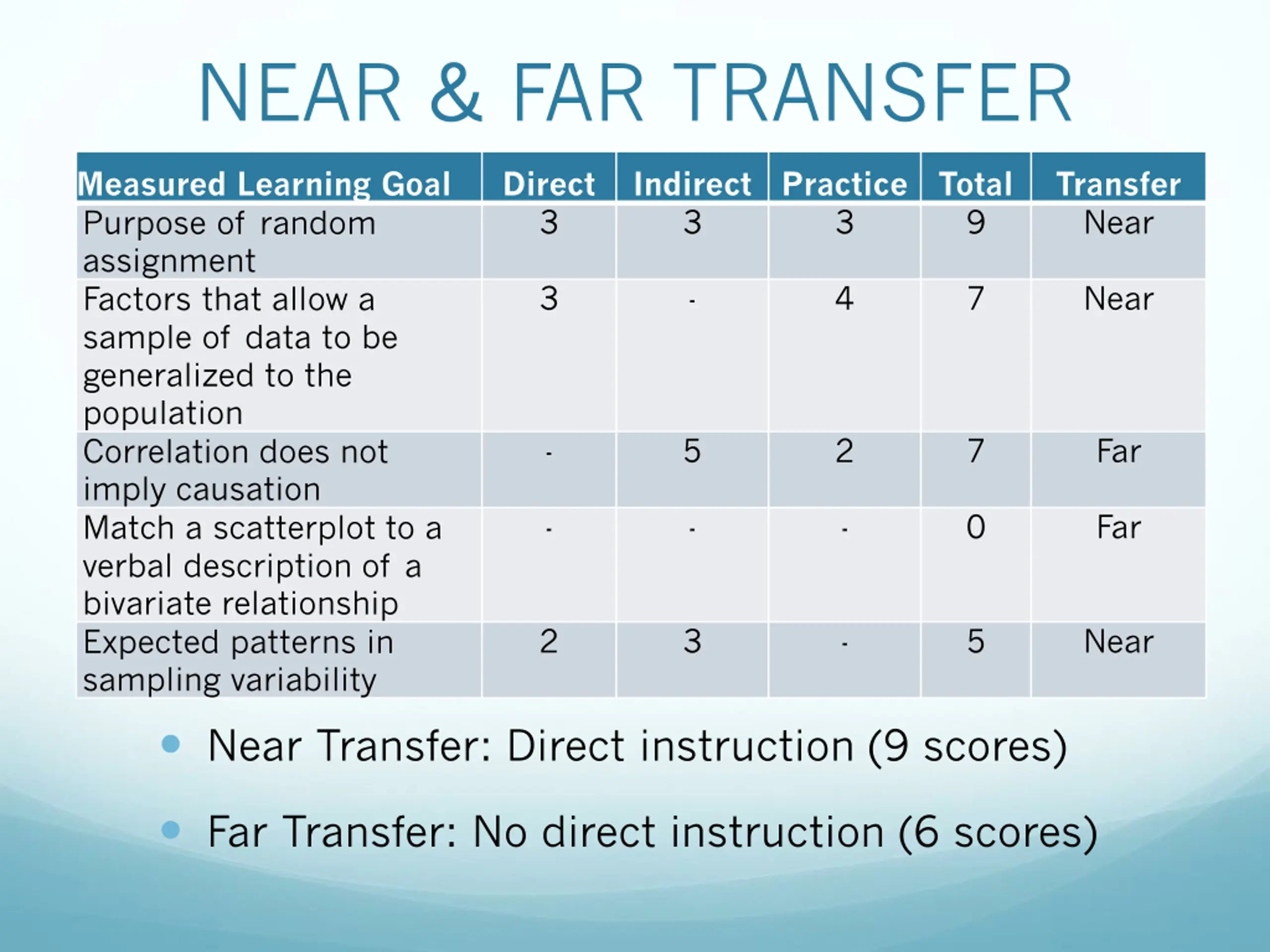 NEAR & FAR TRANSFER Measured Learning Goal Purpose of random assignment Factors that allow a sample of data to be generalized to the population Correlation does not imply causation Match a scatterplot to a verbal description of a bivariate relationship Expected patterns in sampling variability Near Transfer: Direct instruction (9 scores) Direct 3 Indirect 3 Practice 3 Total 9 Transfer Near 3 - 4 7 Near - 5 2 7 Far - - - 0 Far 2 3 - 5 Near Far Transfer: No direct instruction (6 scores)